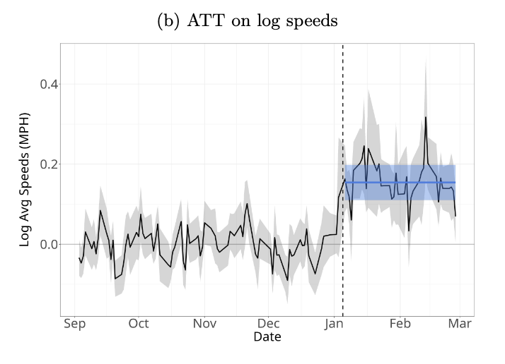 Even though only NYC implemented congestion pricing, average speeds in most cities increased in January and February. To get a better counterfactual, they used a synthetic control formed from other cities. They found a significant ATT (15%) on daily and hourly average speed.