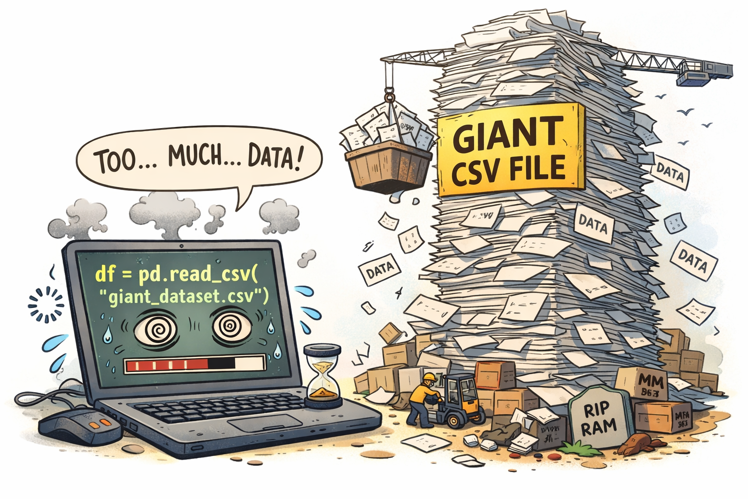 When you use read_csv() or pd.read_csv(), what happens under the hood is that the entire dataset is loaded into your computer’s RAM (Random Access Memory). If the dataset is larger than the available RAM, your computer will struggle to handle it, leading to crashes or extremely slow performance. This is particularly bad in languages like R and Python, which are not optimized for handling datasets that exceed memory limits.