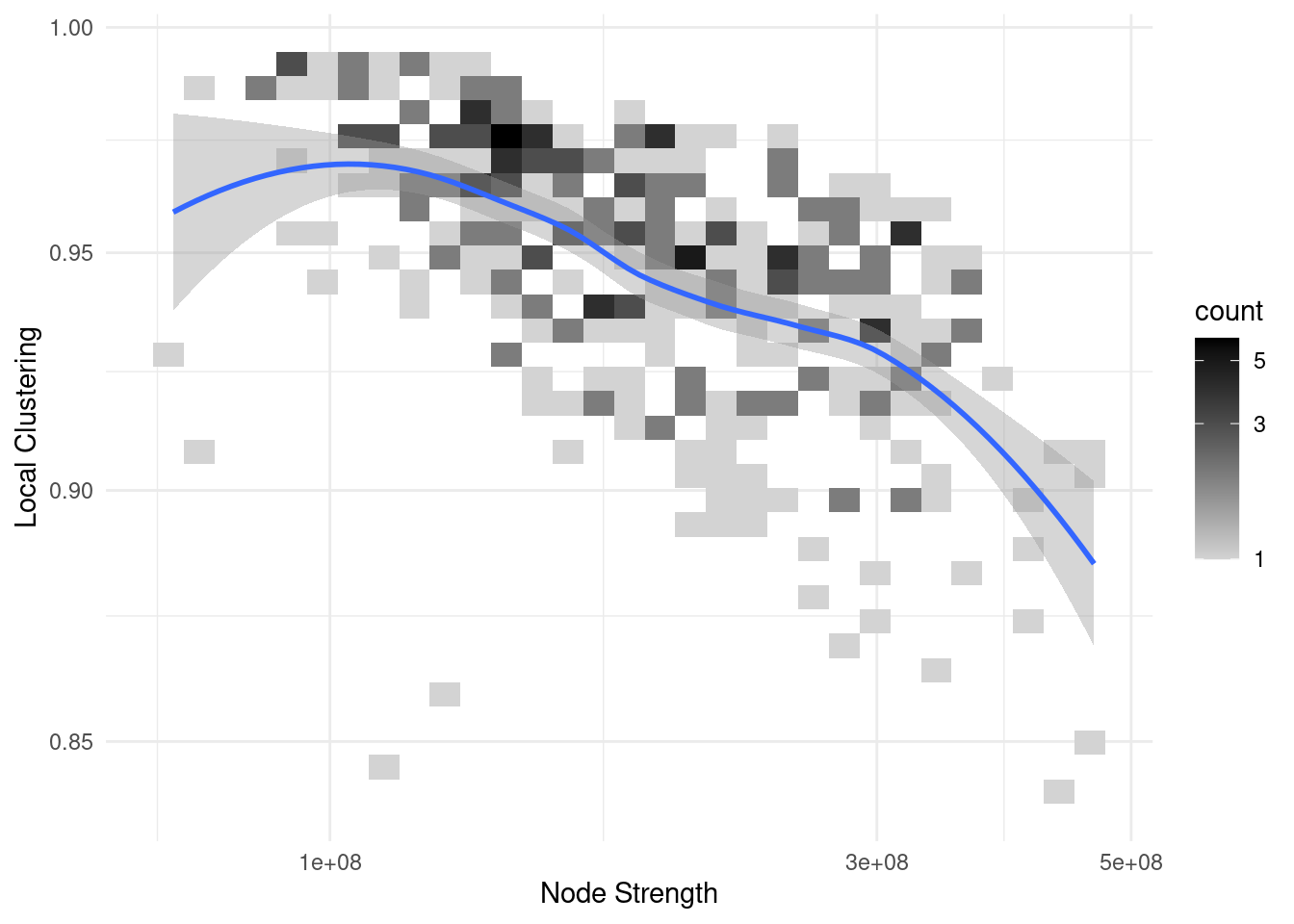 Let’s see the clustering coefficient of the network. There are several generalizations of the clustering coefficient for weighted graphs. Here we use the definition by A. Barrat: \[ C_i^w = \frac{1}{s_i(k_i-1)} \sum_{j,h} \frac{w_{ij} w_{ih}}{2} A_{ij} A_{ih} A_{jh} \] where \(s_i\) is the strength of node \(i\), \(k_i\) is the degree of node \(i\), \(w_{ij}\) is the weight of the edge between nodes \(i\) and \(j\), and \(A_{ij}\) is the adjacency matrix of the graph.