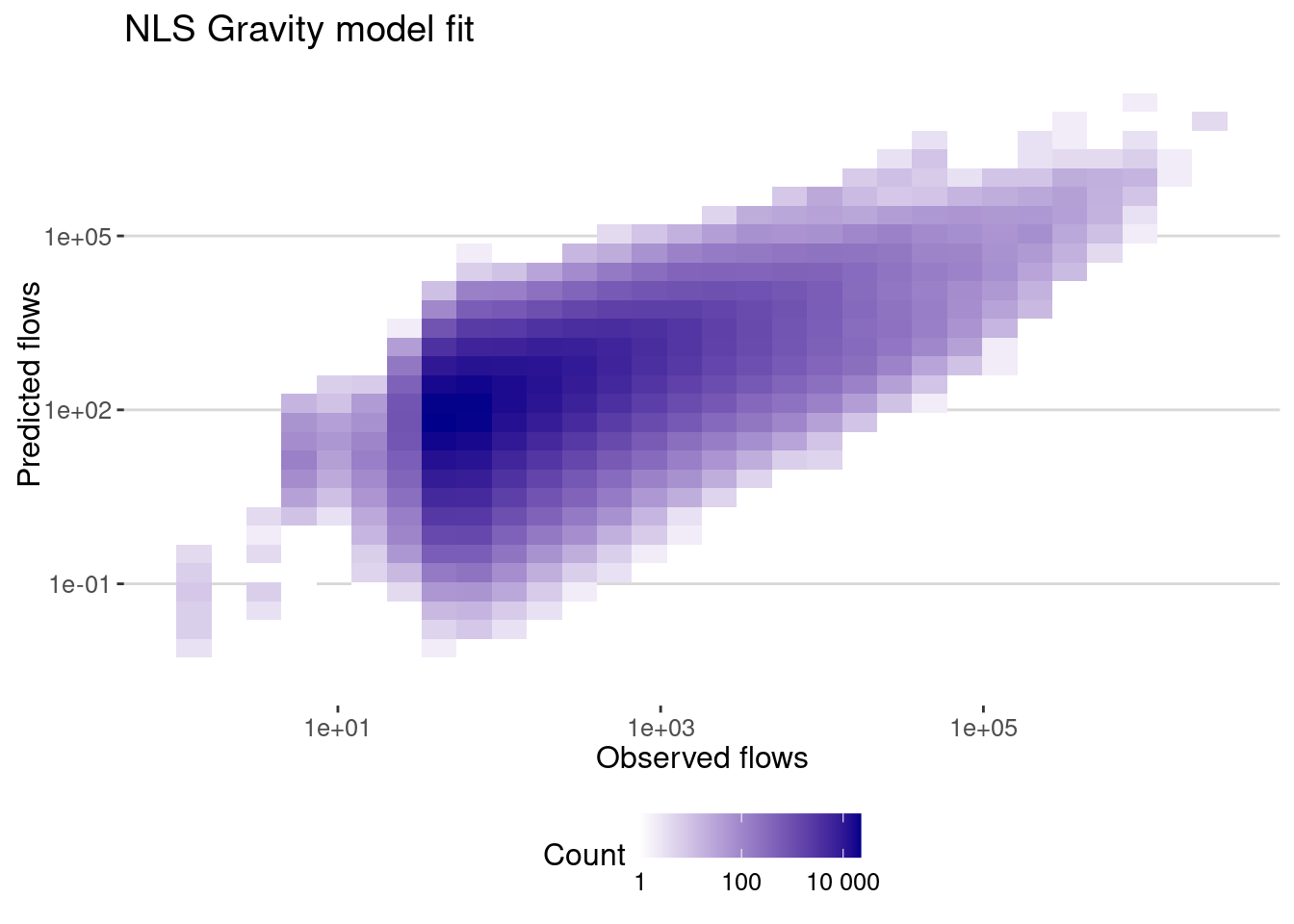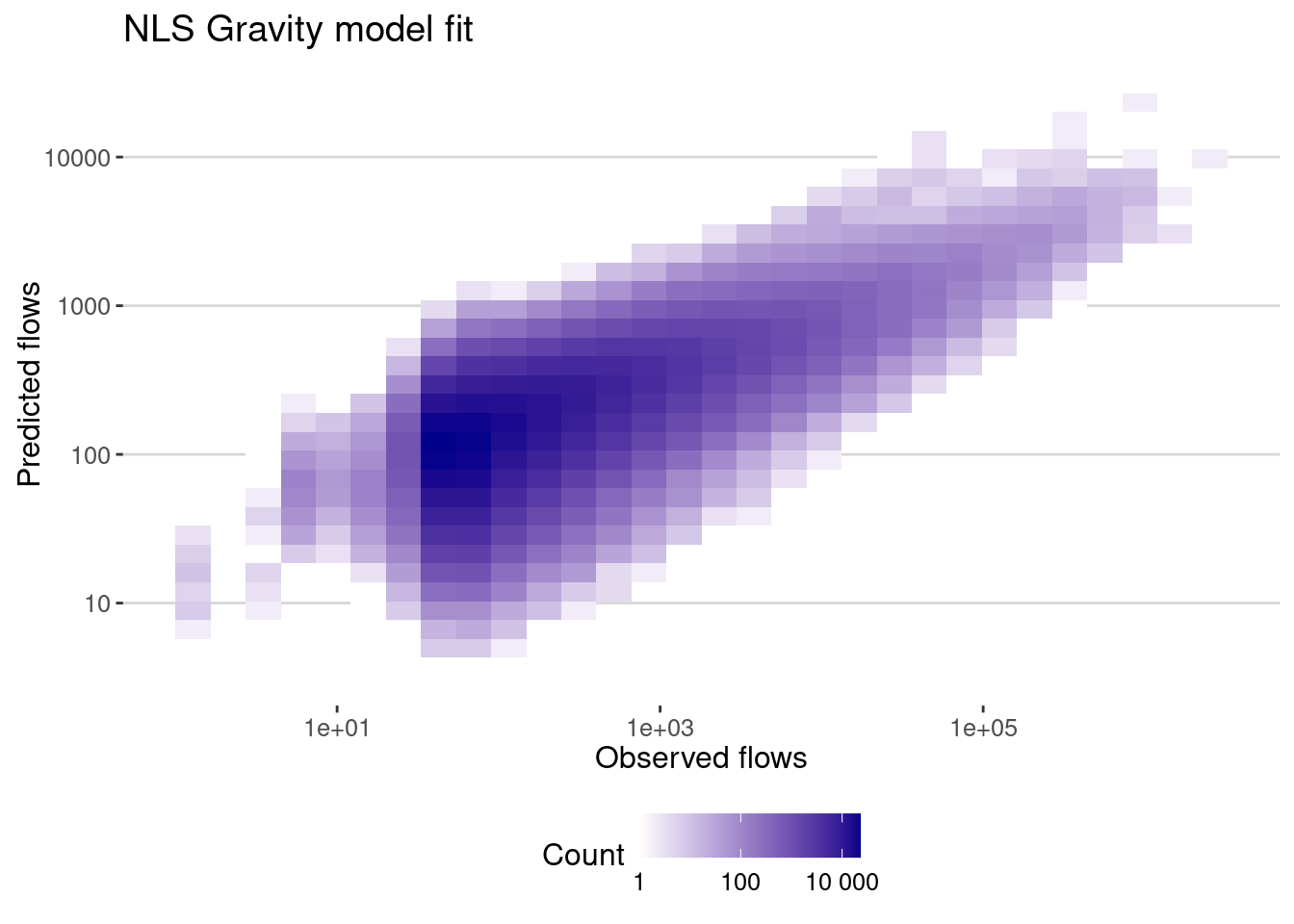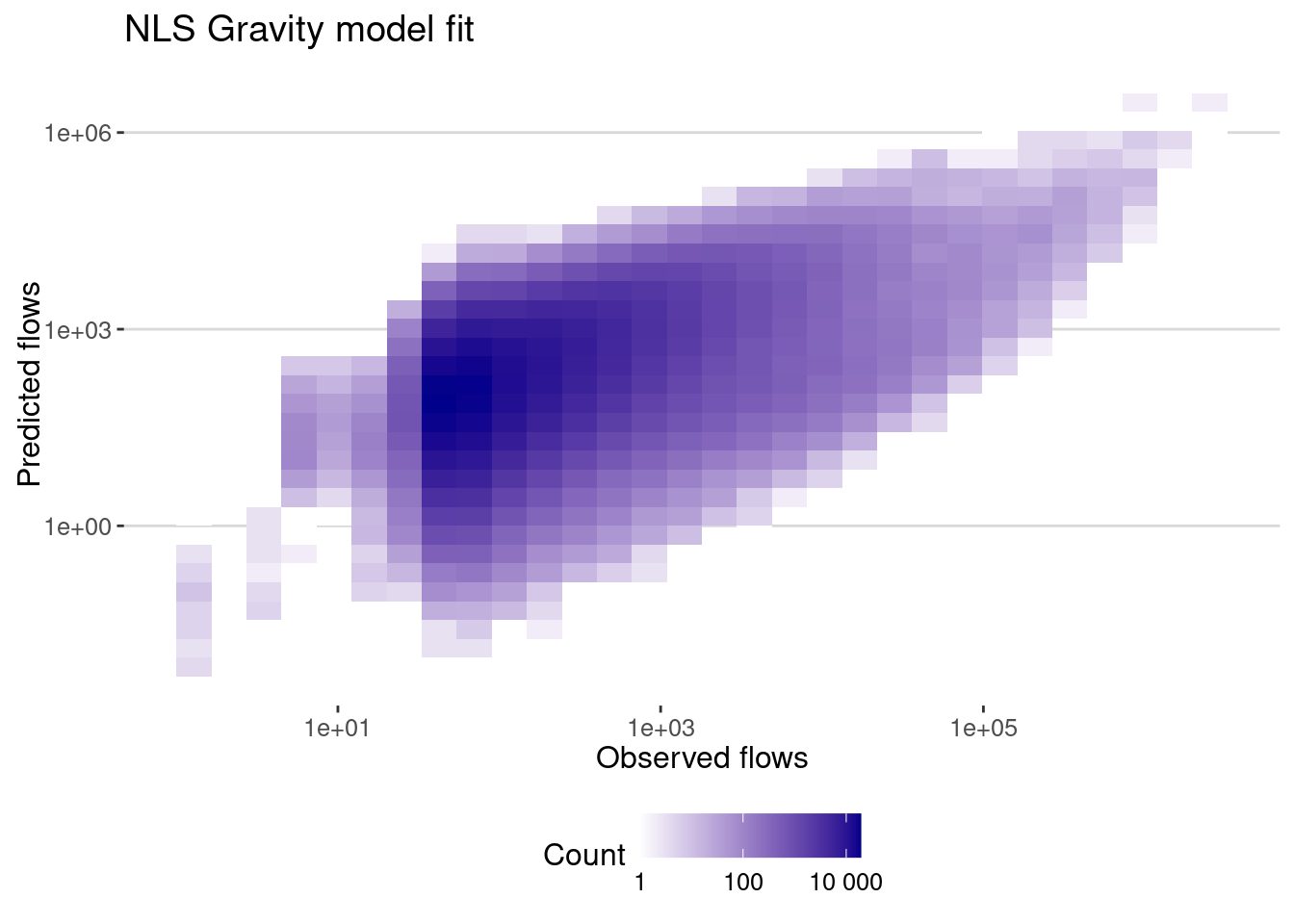 labs(title="NLS Gravity model fit",x="Observed flows",y="Predicted flows")and the correlation