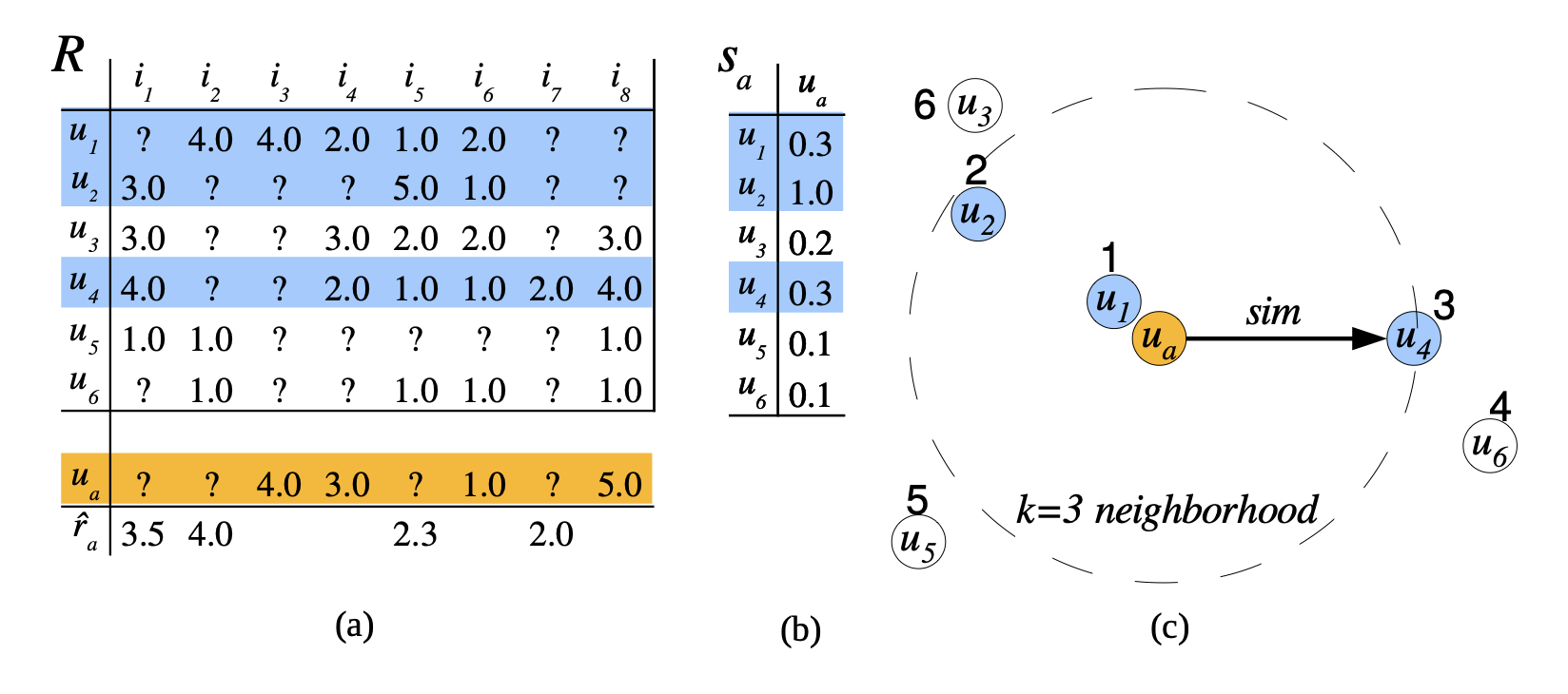 Find the \(K\) most similar users to user \(i\) based on their past behavior. We can use the cosine similarity between the users’ vectors to do this.