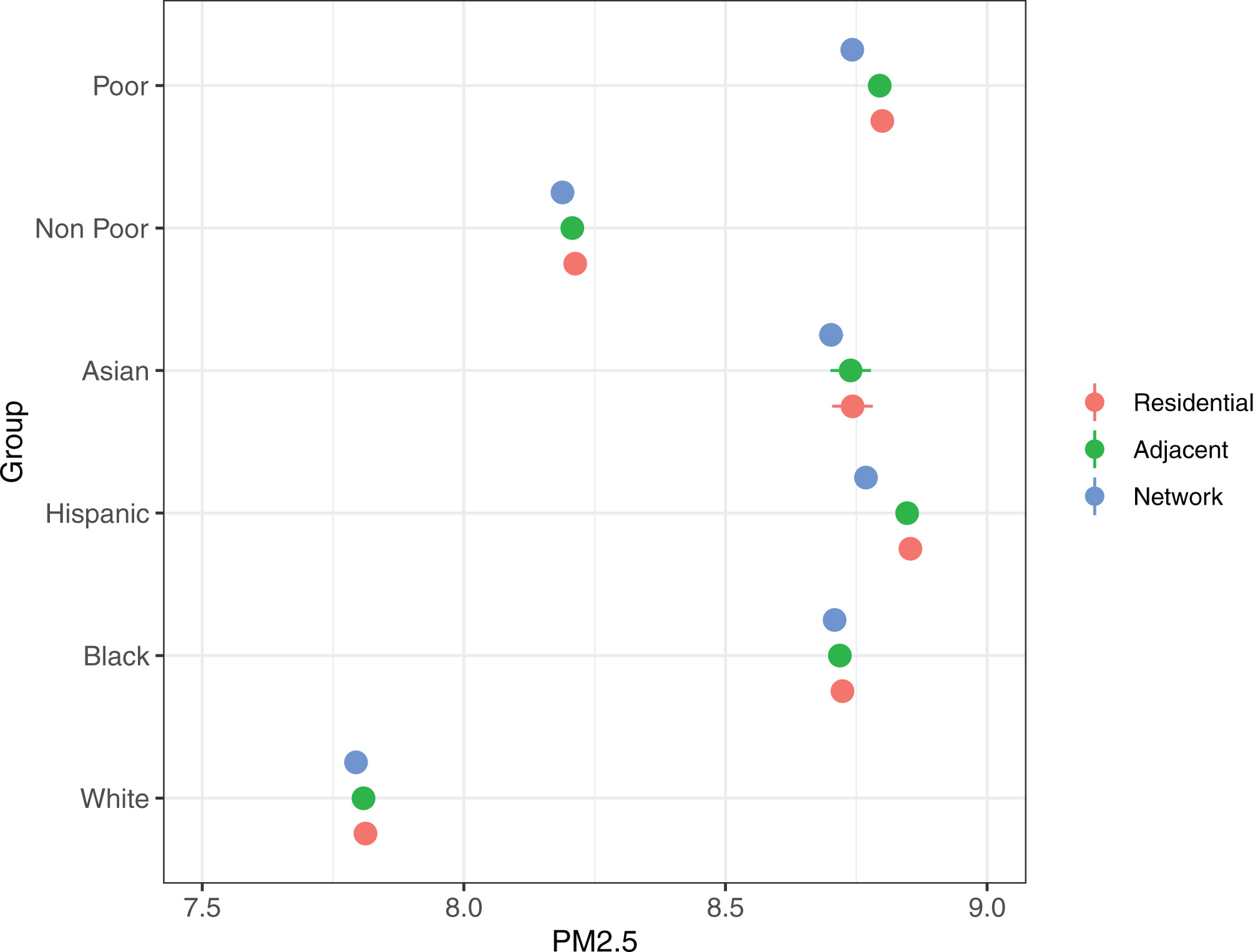 PM2.5 exposure in residential neighborhoods, adjacent neighborhoods, and nonadjacent neighborhoods that residents visit (network)
