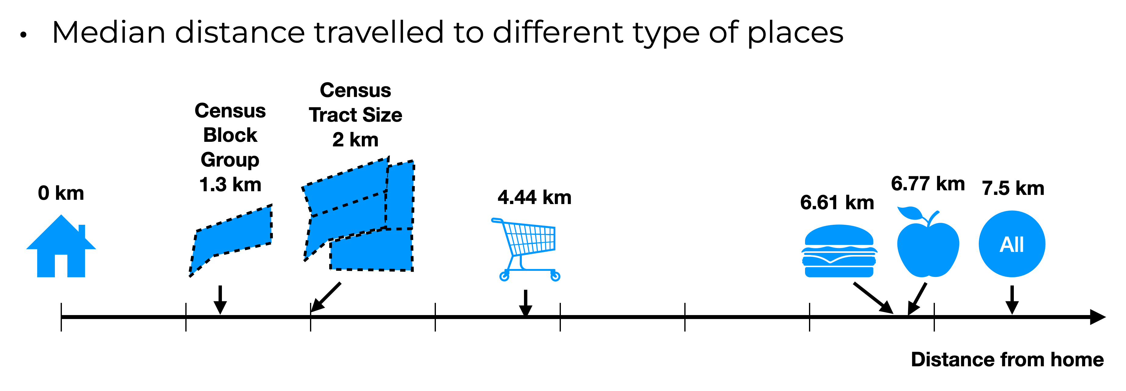 Median distance to different type of places in the top 11 metro areas in the US, from [5]