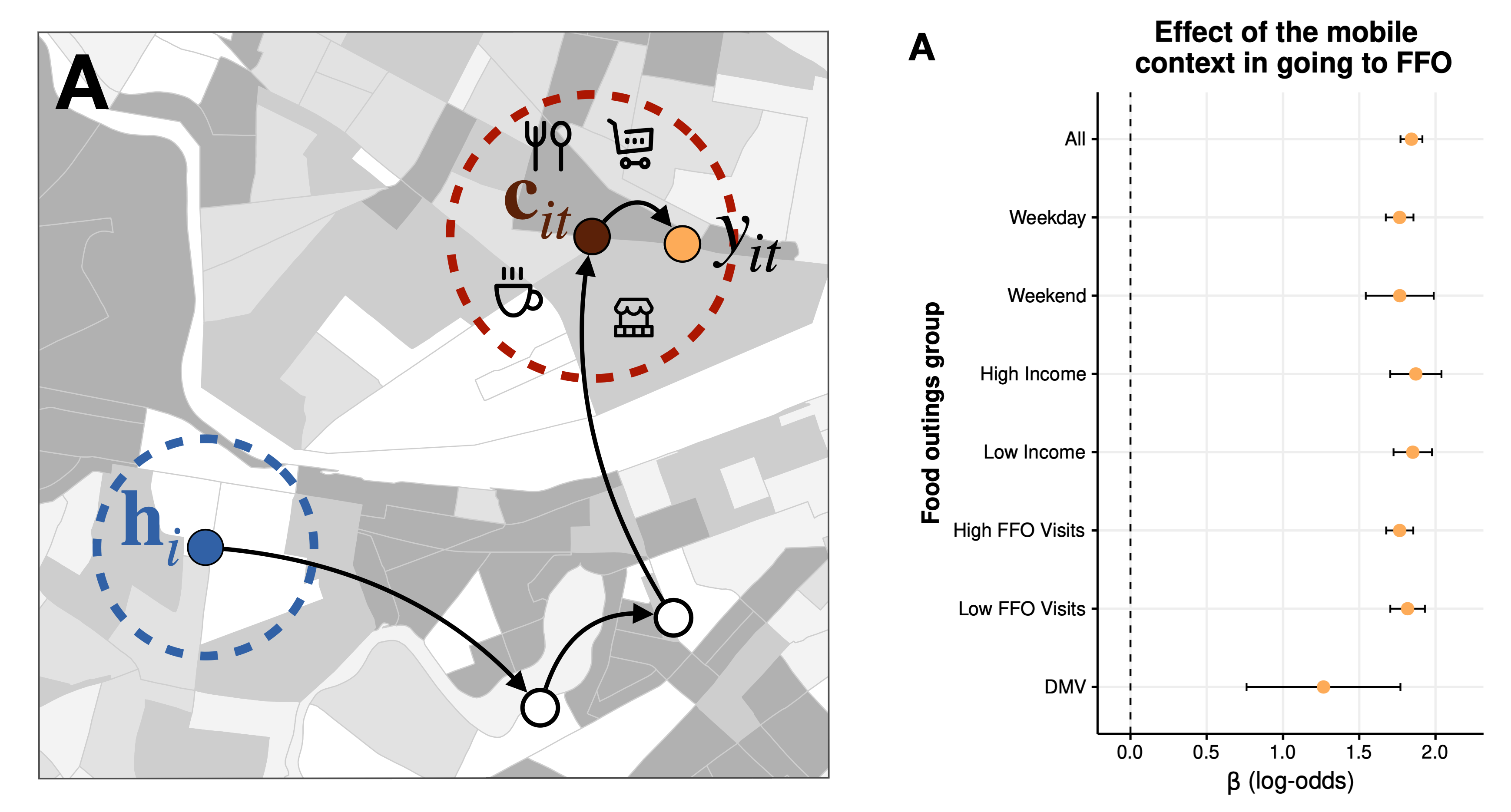 Impact (log-odds) of being exposed to fast-food environments in eating there, from [5]