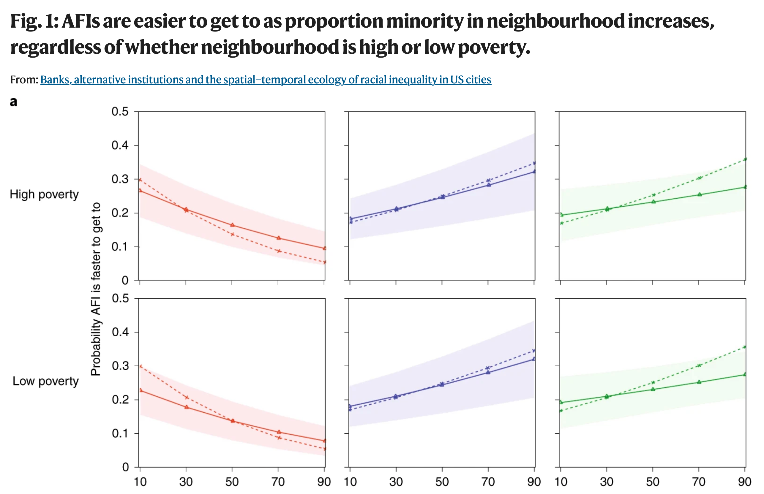 How does living in minority neighbourhoods affect access to conventional banks versus alternative (predatory) financial institutions (AFIs) such as check cashers and payday lenders?. Use of Google Places API and routes to get those POIs and routes to them
