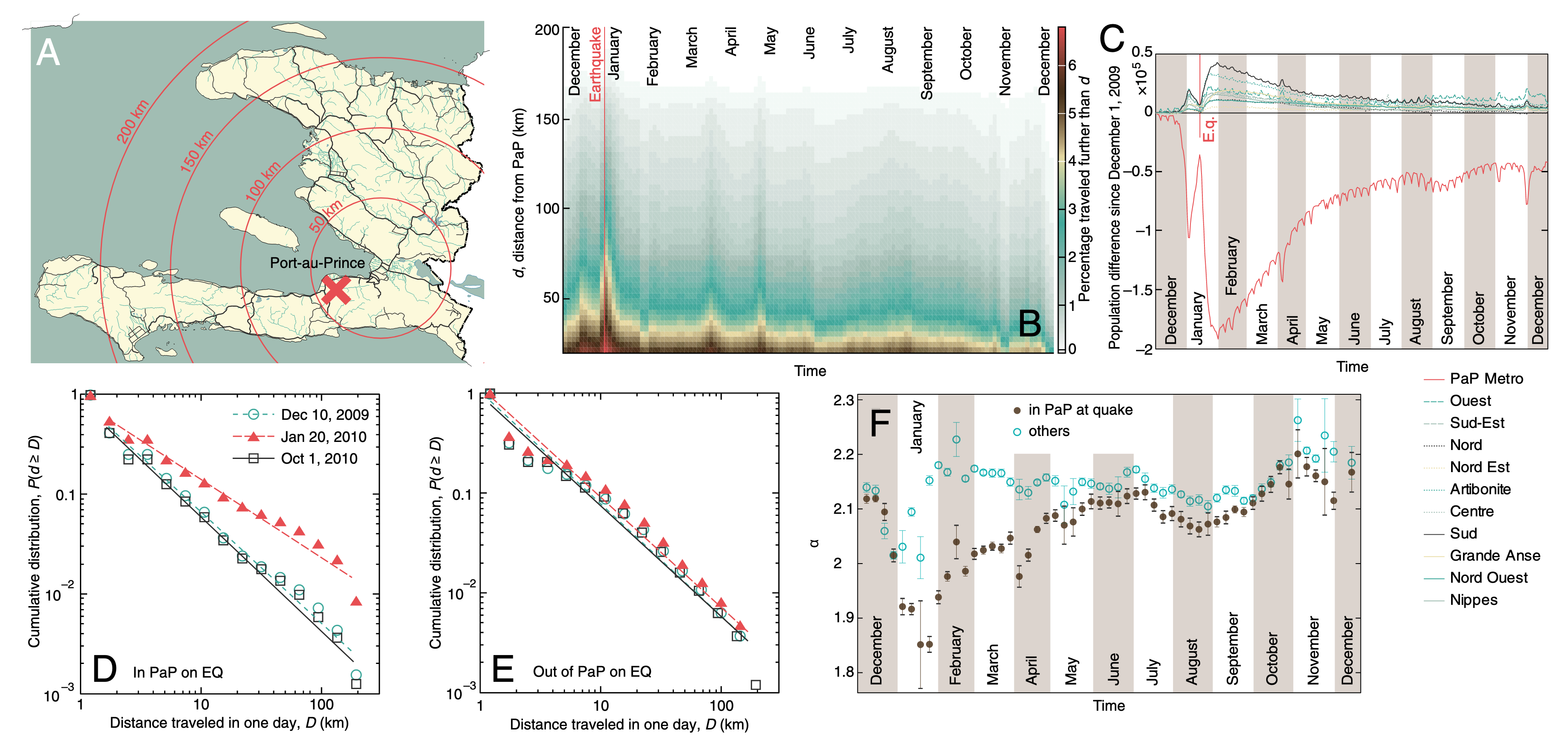 Example: Lu et al. [8], used CDR to study predictability of displacement mobility patterns after the Haiti Earthquake in 2010. 1.9 million mobile phone users: estimated 23% of population in the capital displaced. But displacement destinations were highly correlated with pre-disaster mobility patterns (mobility predictability).