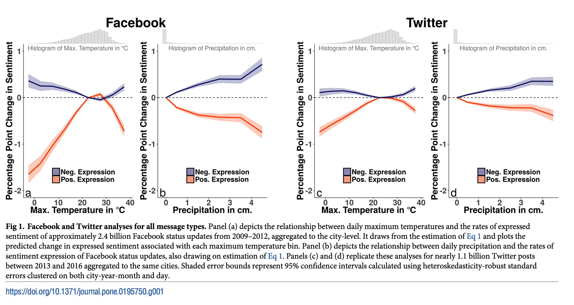 Analyzing tens of millons of posts on social media in different cities, Baylis et al [5] found that colder weather is associated with more negative sentiment, while warmer weather is associated with more positive sentiment.