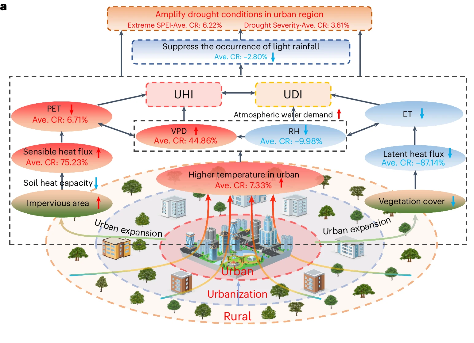 In [4], they found that urbanization exacerbates the probability of extreme droughts: by 2050, 50-70% of urban regions would consistently suffer droughts due to urban expansion