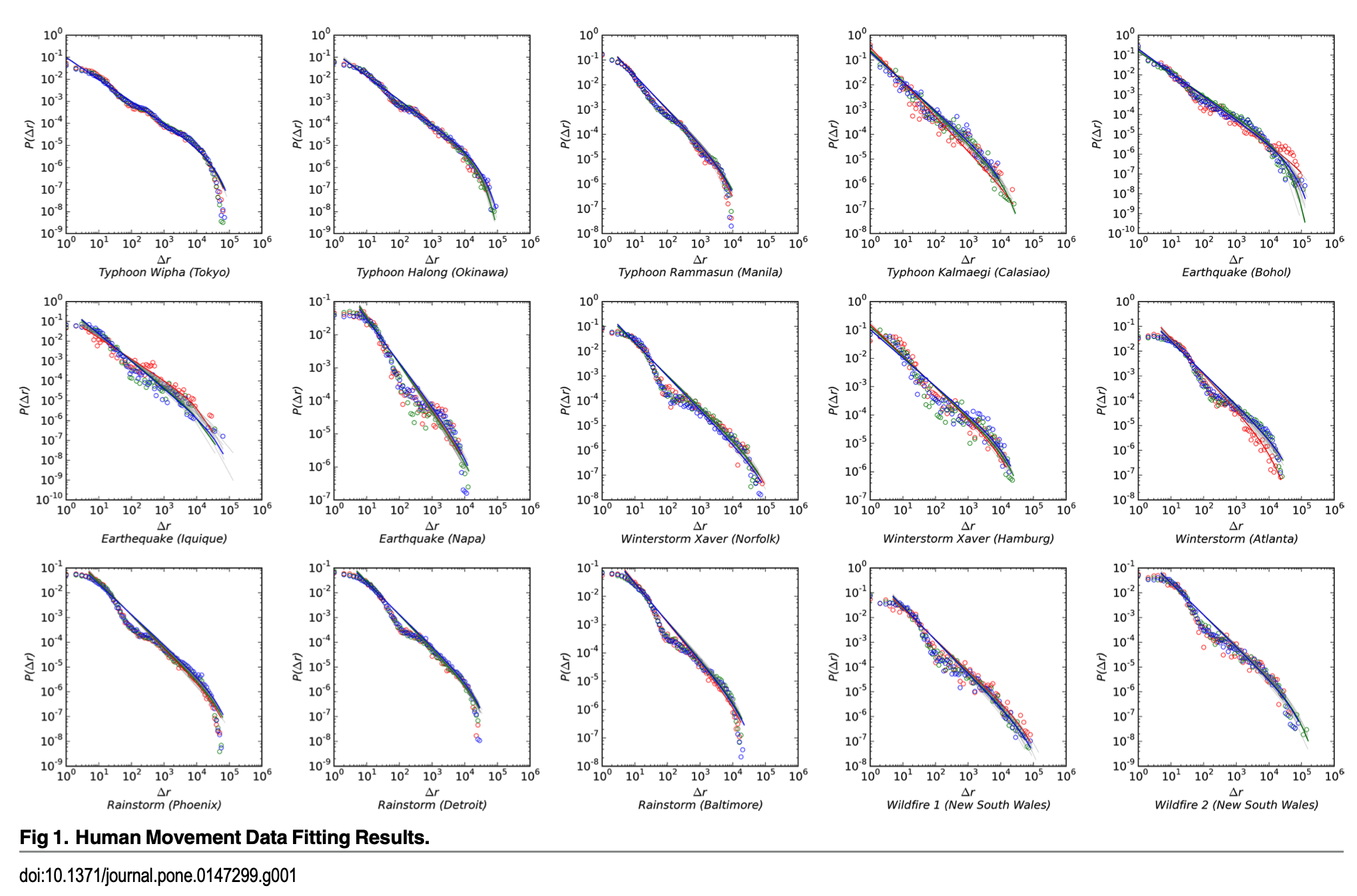 A general framework to study displacement and evacuation patterns is to detect mobility anomalies and universalities in post-disaster movements. For example, Yabe et al [10], found some relationships between seismic intensity levels and evacuation rates. However, distances traveled are not correlated with the intensity of the earthquake.