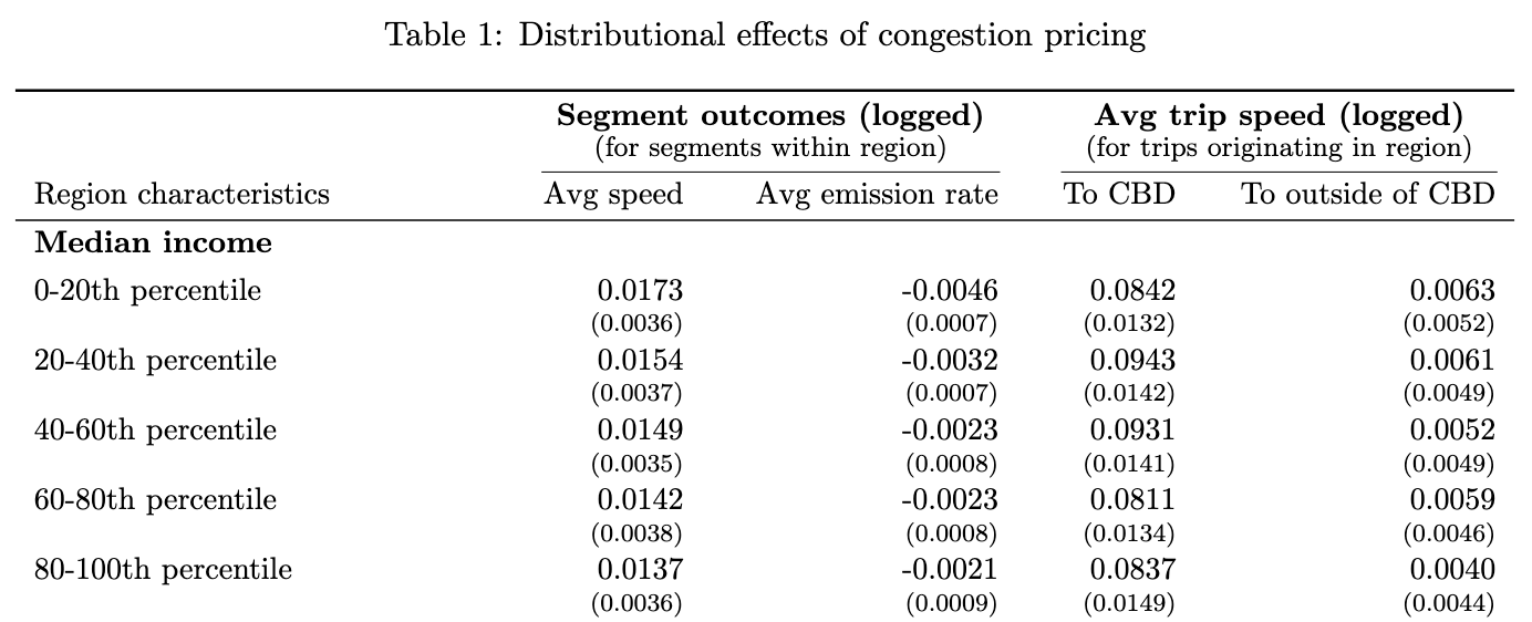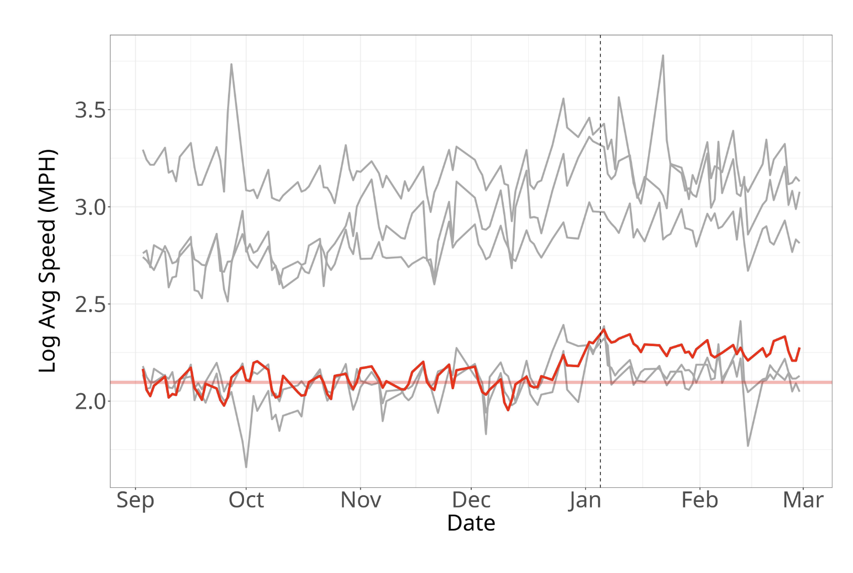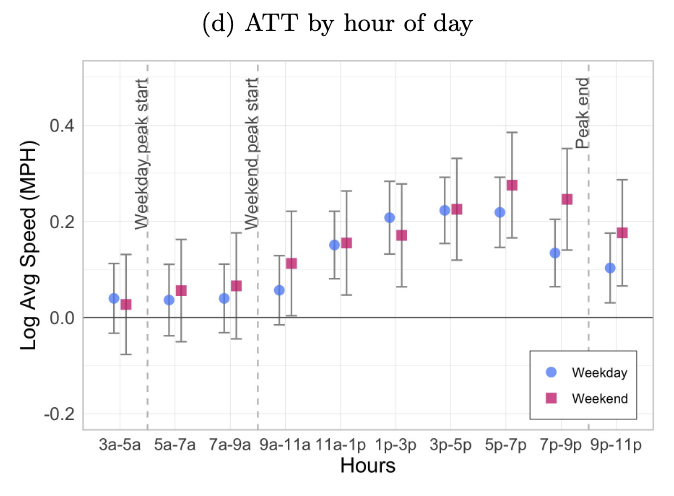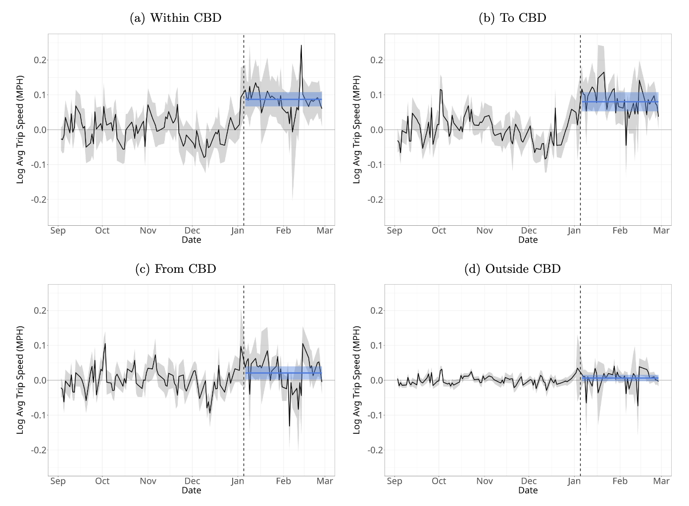 Even though only NYC implemented congestion pricing, average speeds in most cities increased in January and February. To get a better counterfactual, they used a synthetic control formed from other cities. They found a significant ATT (15%) on daily and hourly average speed.
