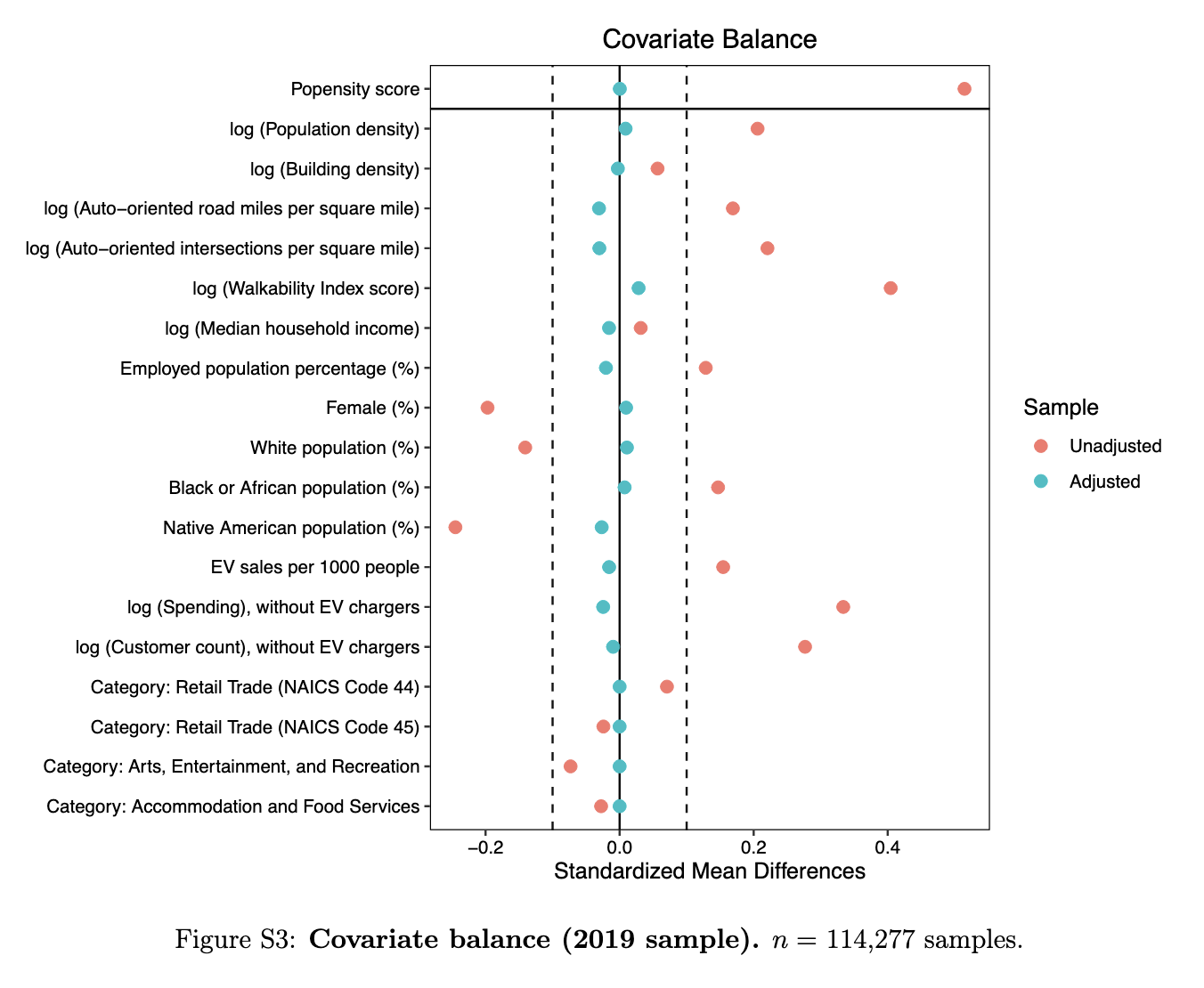 One limitation of that approach is that ECVS provides might place them strategically to maximize the benefits of them, in areas that could have more growth, for example. To address this endogeneity, the authors use Propensity Score Matching to pair same-category POIs in the treatment and control group.