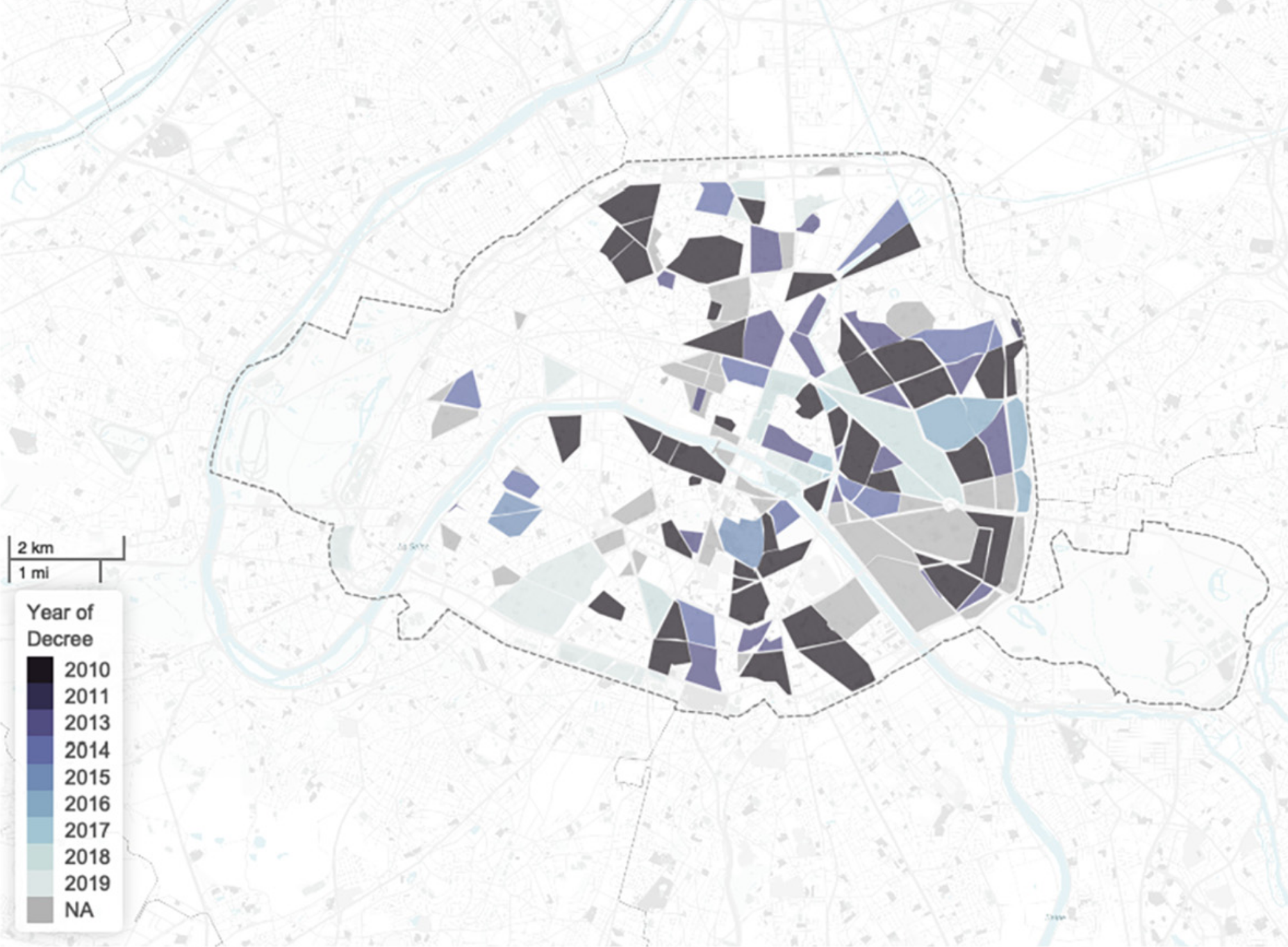 There were 141 slow zones introduce in Paris, located within the central area of Paris and implemented across ten years.