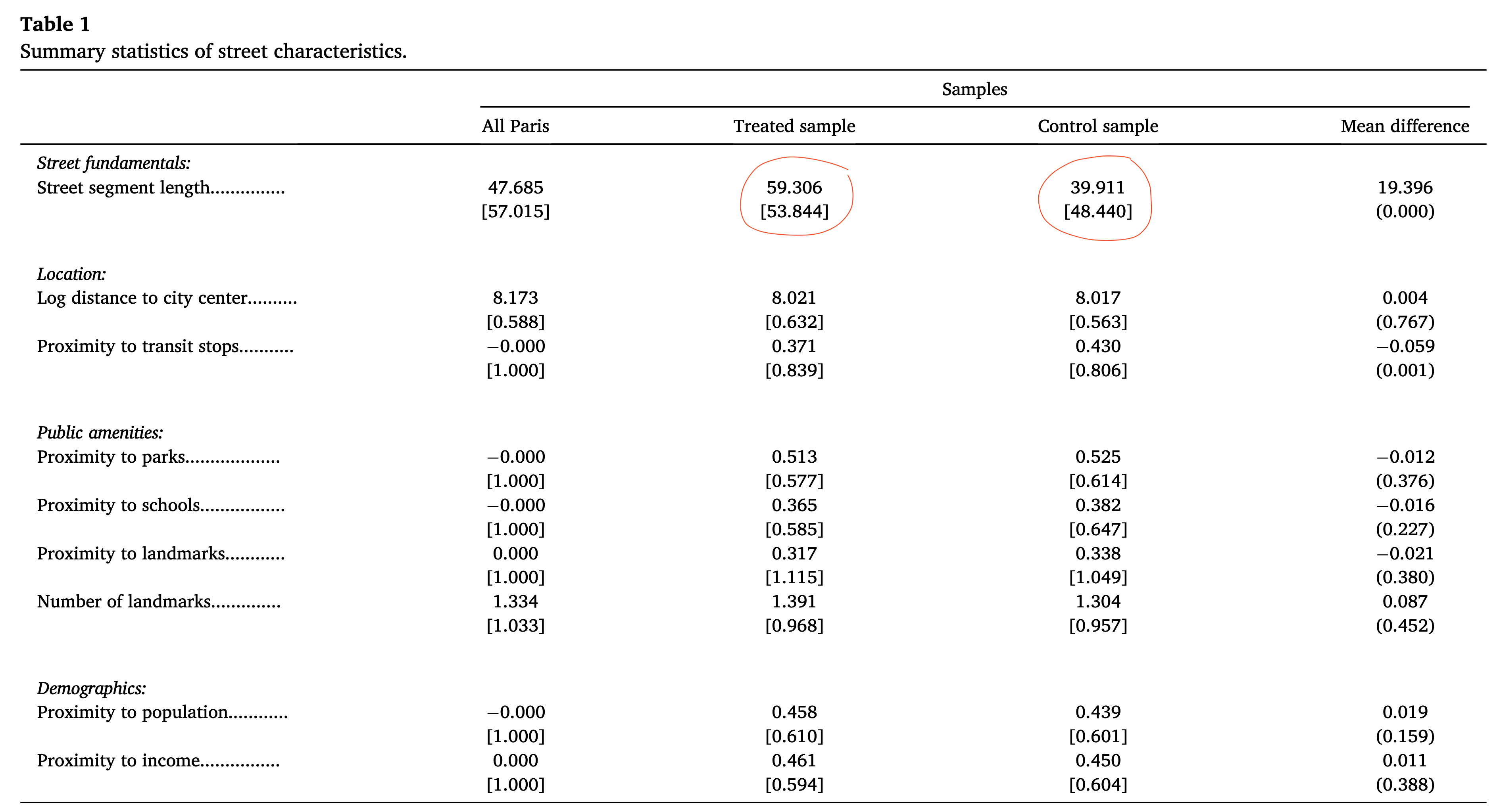 Their choice of treated and control groups was made to maximize their similarity across all other potential confounders like length, proximity to the city center, transit stops, parks, etc., that might affect the outcome of the policy. They only found differences in segment length, thus they control for it later.