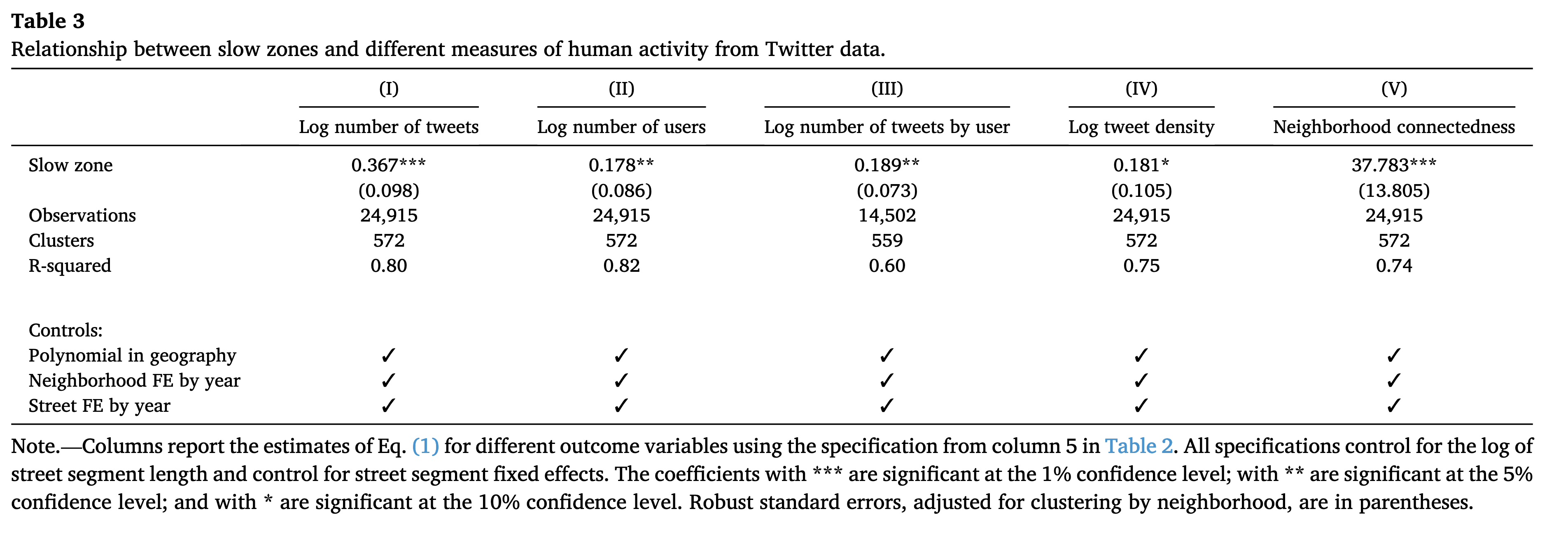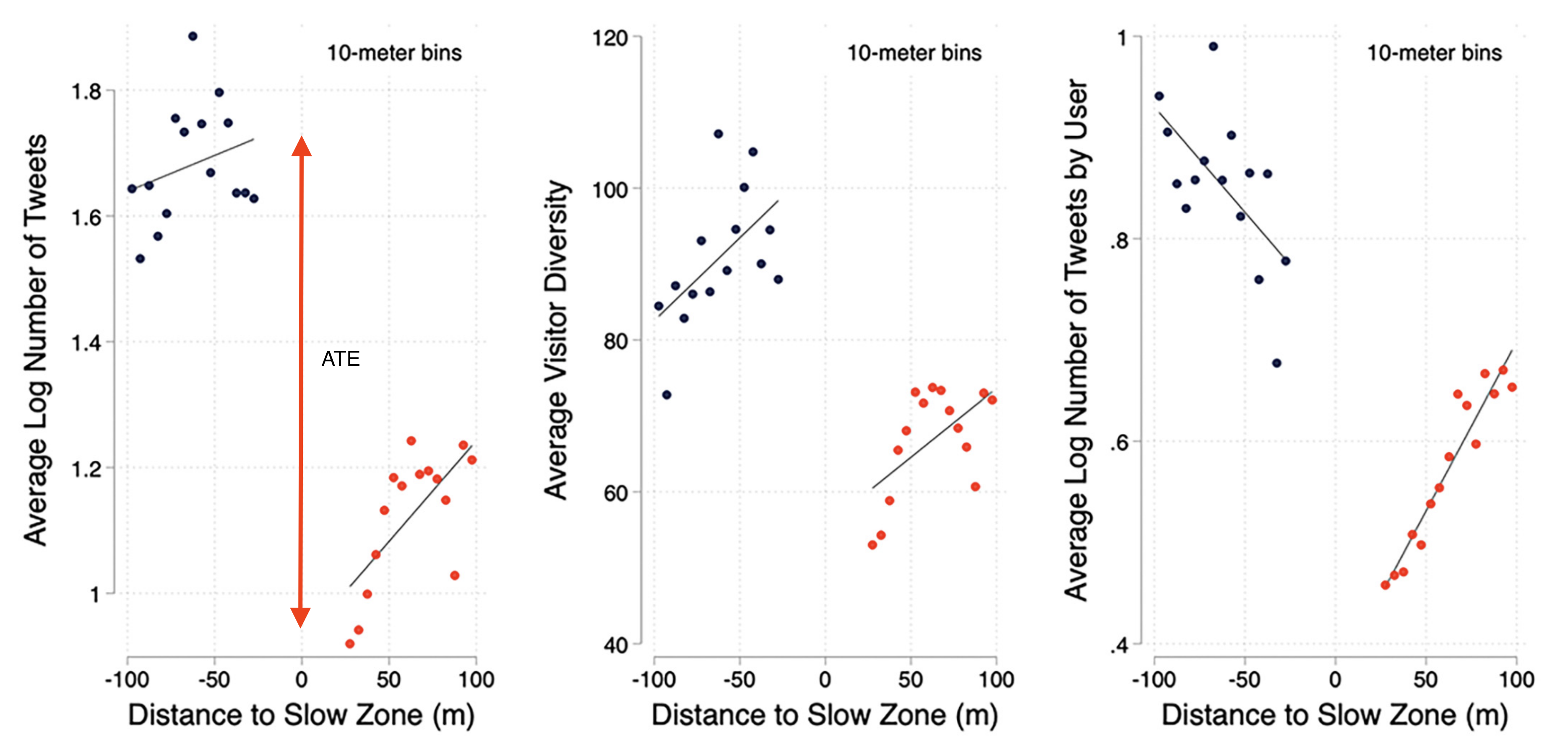First: does human activity vary across the boundaries of slow zones? There appears to be a discontinuity in the regressions of activities across the boundaries. This justifies their choice of control and treatment groups.