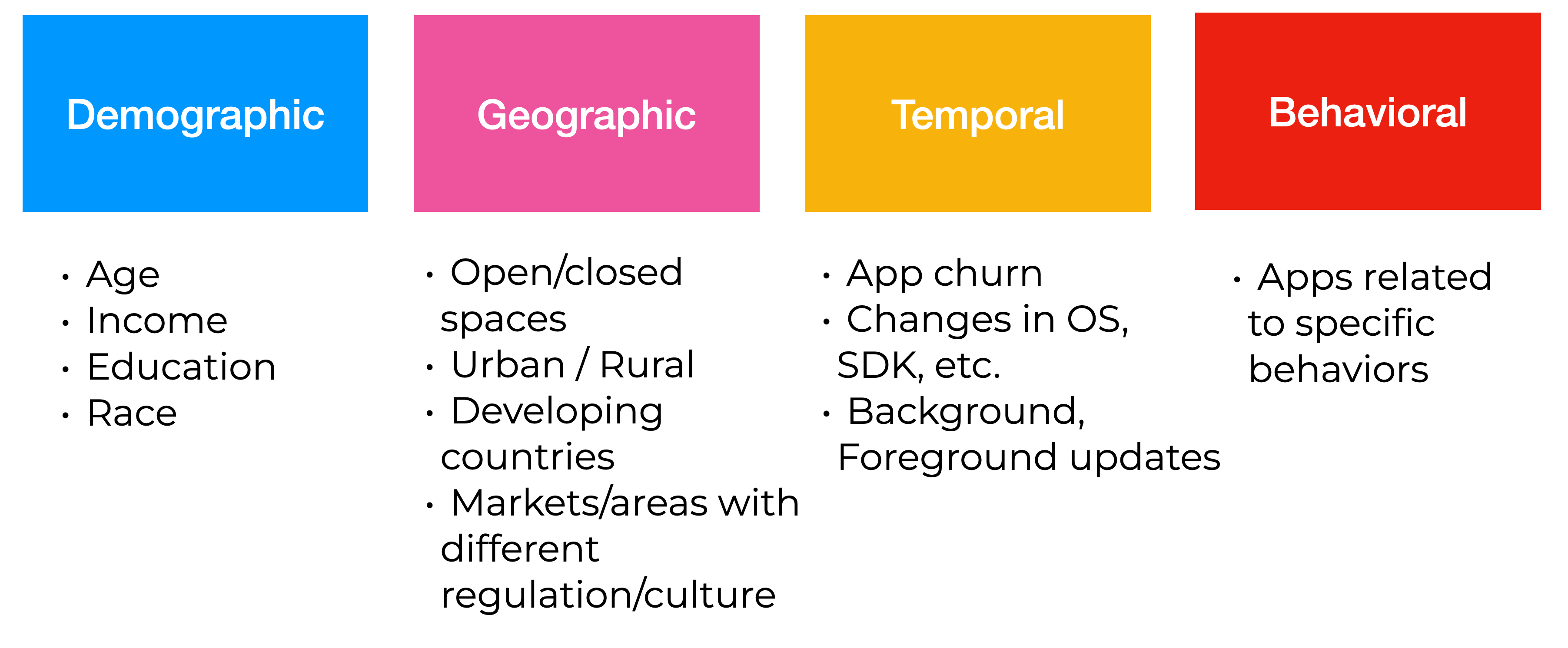 Pre-stratification or panel definition: since the sample of users in LBS data is not random, we can use external data to correct those biases to select a more representative sample of users. Typically, we would like those users to be equally distributed across geographical areas, demographics, and behaviors. This is only possible if we have access to individual trajectories.