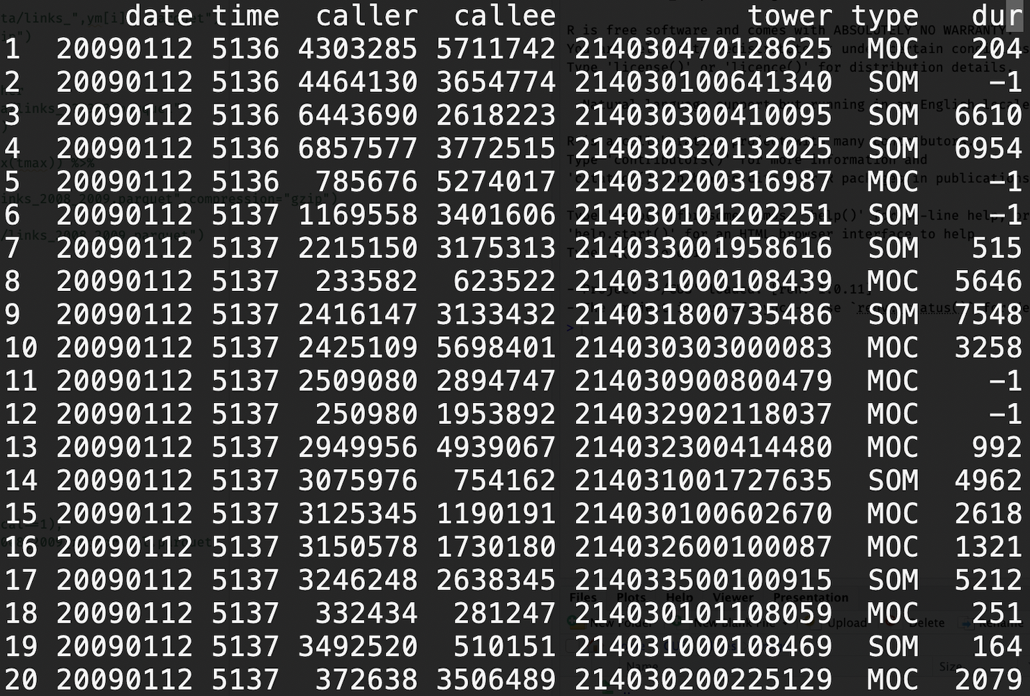 Call Detail Records (CDRs) are records of calls, texts, and data usage made by mobile phone users. They include information about the time, duration, and location of the communication. Here is an example of that data