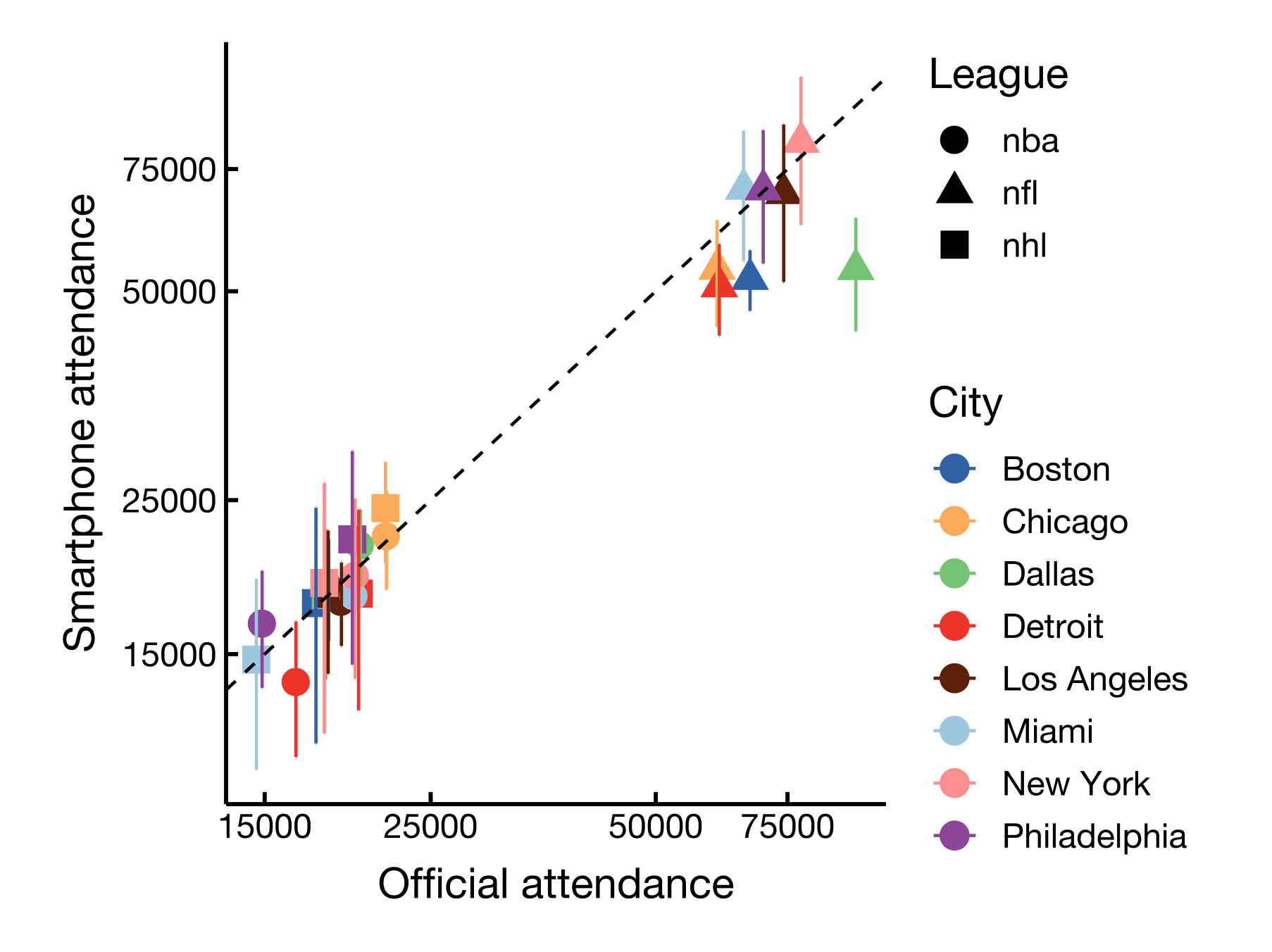 Comparison of the official average attendance to major professional sports games (NFL, NHL, and NBA) with estimations from LBS data