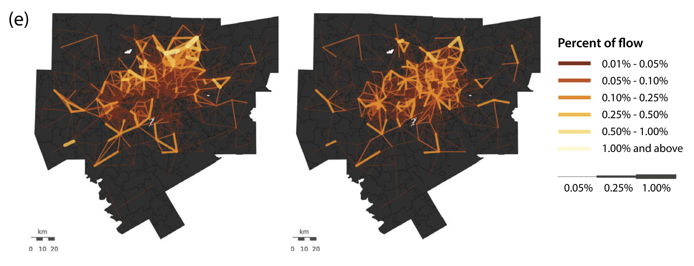 The same technique applies to flows or trips. Using the Department of Transportation (DoT) data, [1] compared the results from LBS data to the number of trips in the DoT data.