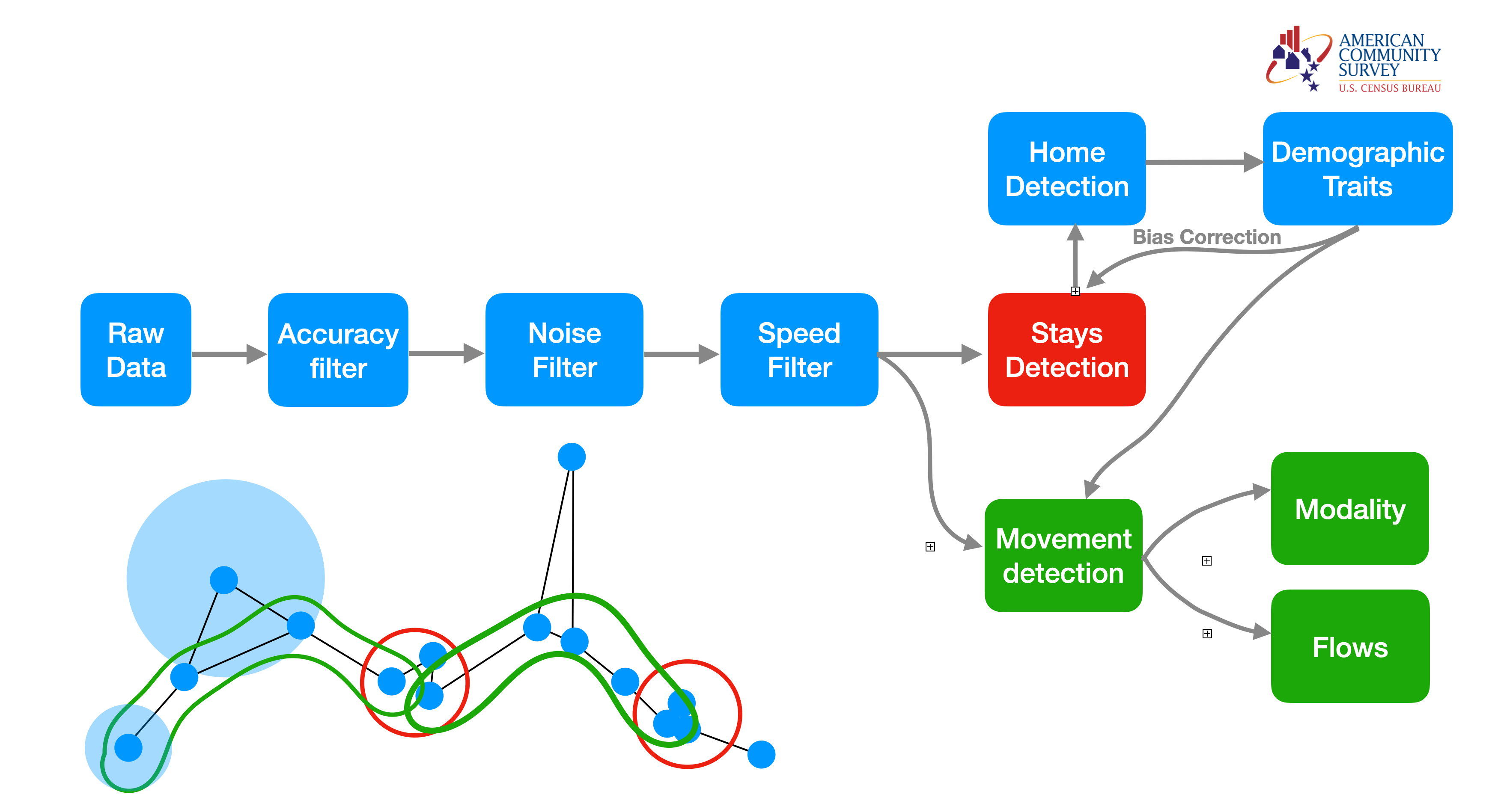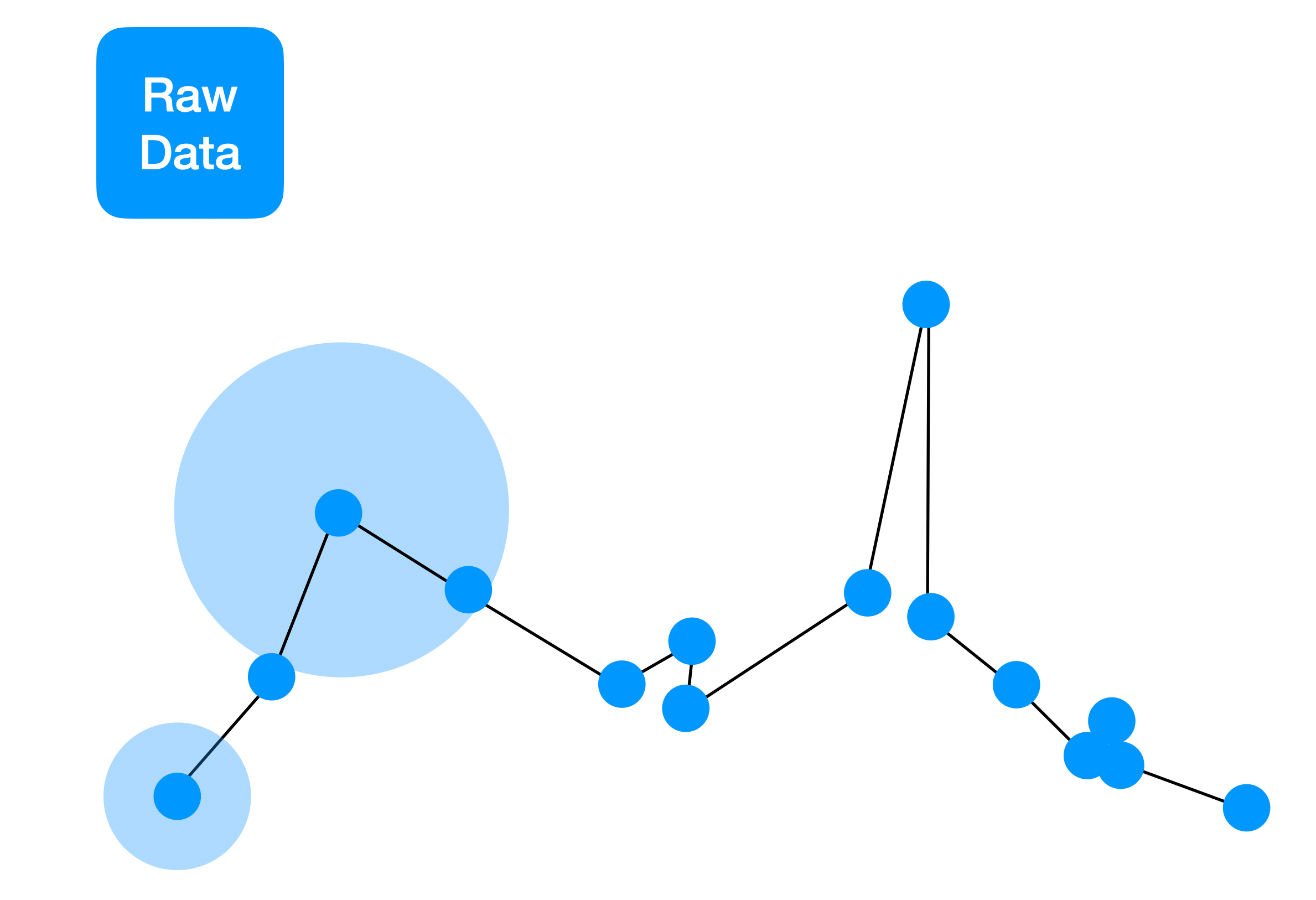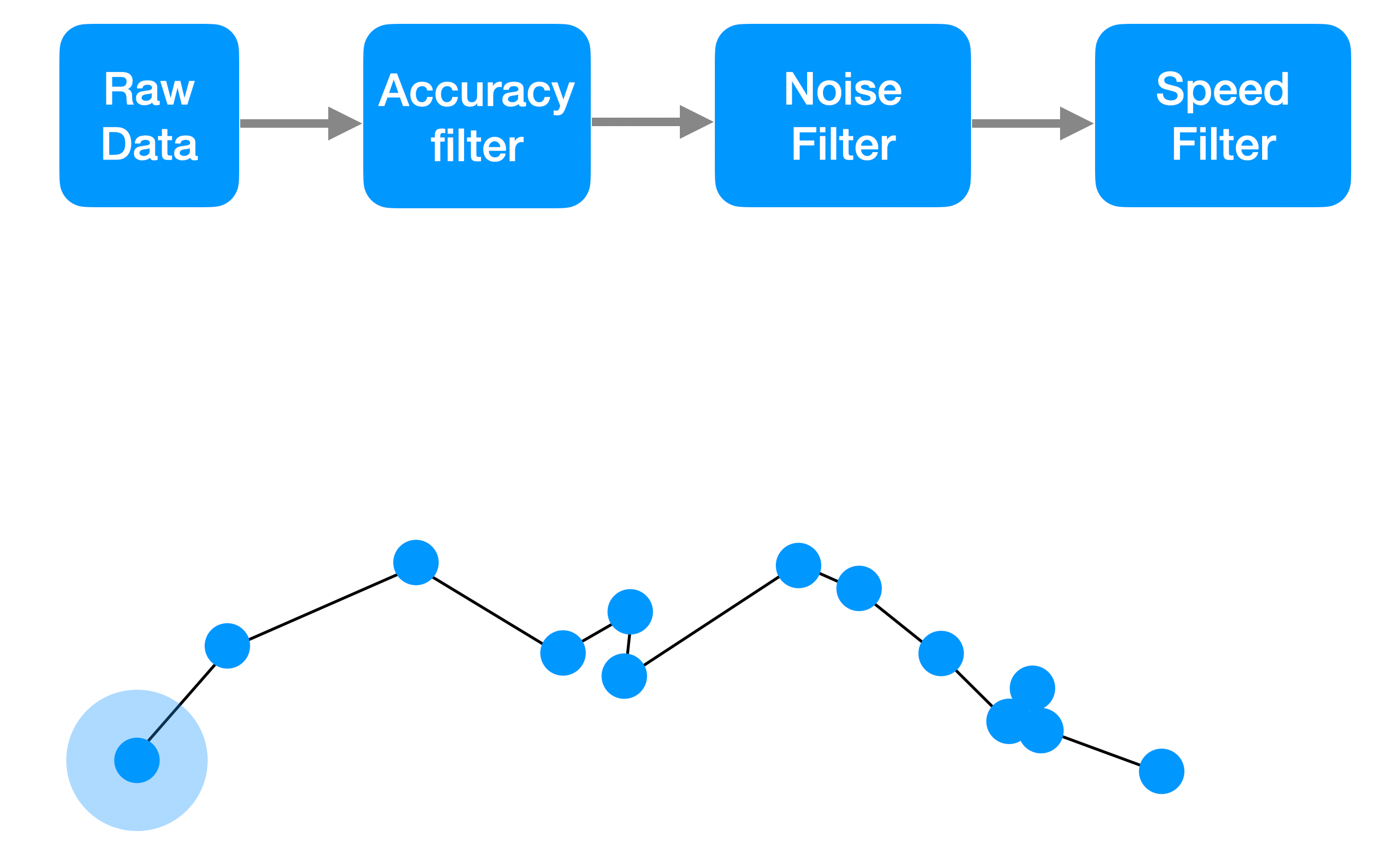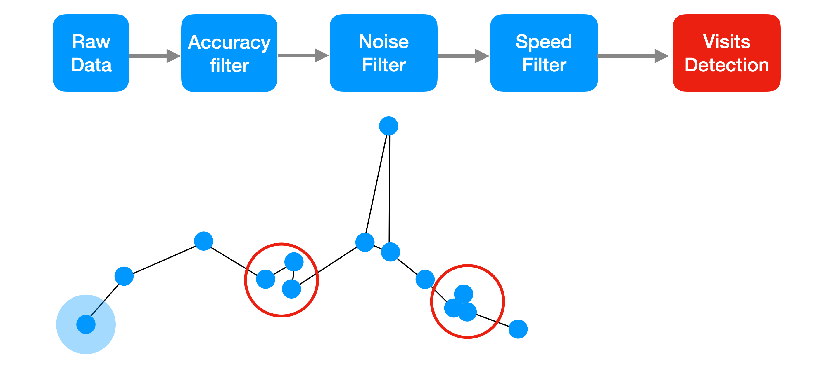 The first step in processing this data is to clean it. This involves removing duplicate locations, filtering out locations with low accuracy, and removing outliers.
