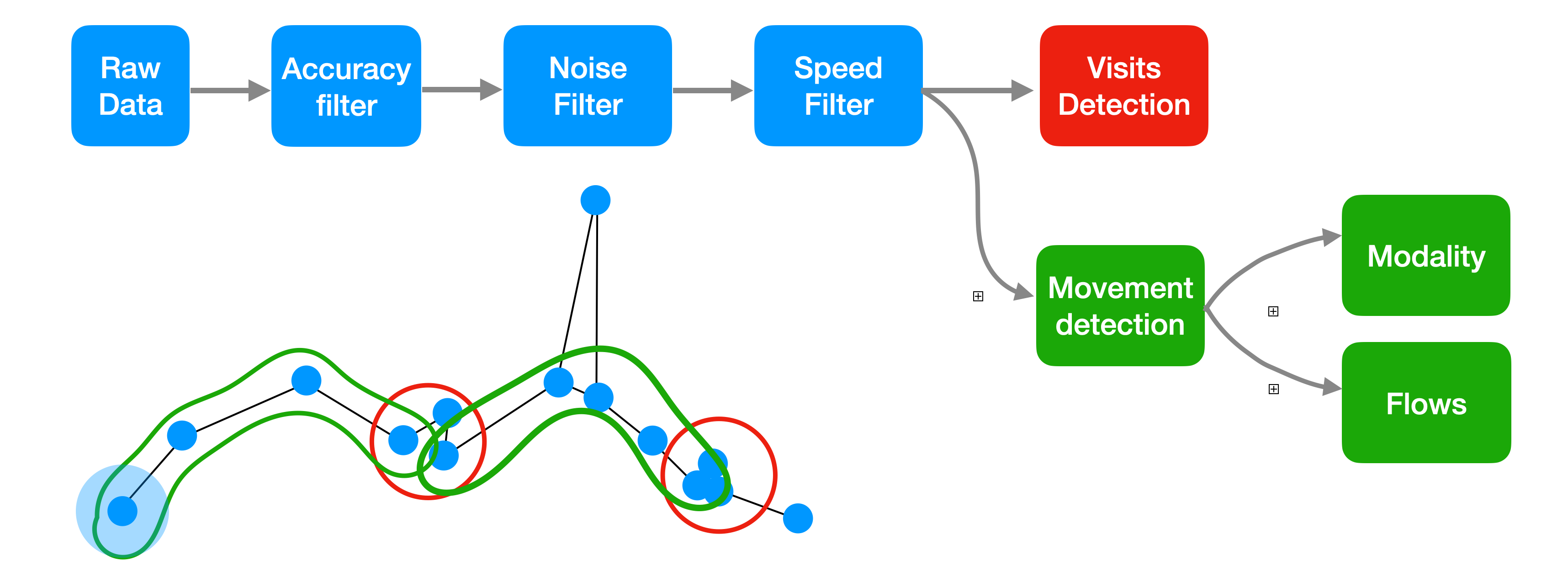 The following step in processing those trajectories is to extract information about visits and trips. This can be done by clustering the locations in space and time. Many methods exist based on ideas similar to DBSCAN (or HDBSCAN). Some of them are the Hariharan and Tomaya [26] or the InfoStop [27].