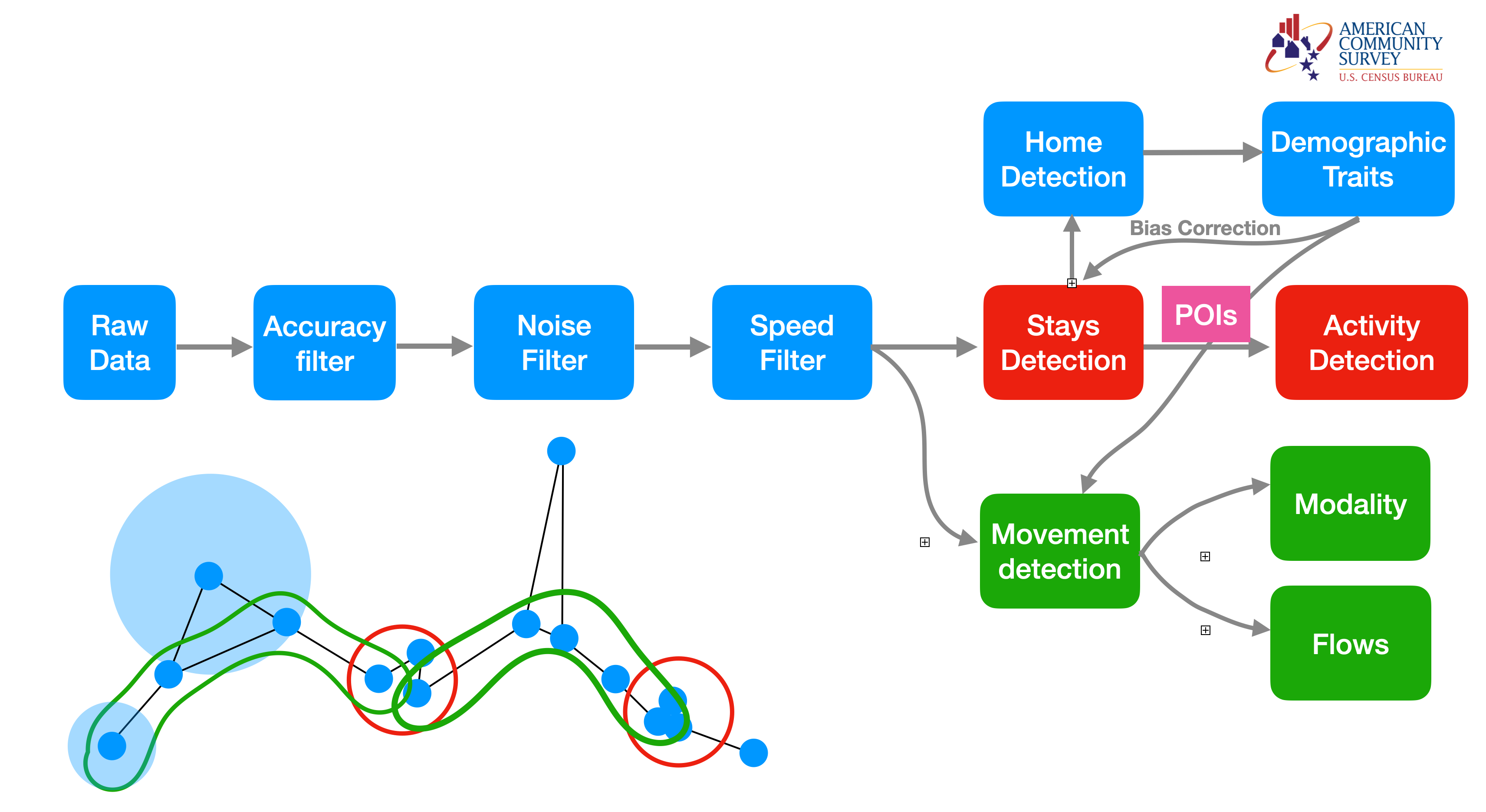 At the same time, we can detect the trips between those visits. Using map-matching, public transportation schedules, and information about the trips, we can detect the mode of transportation.