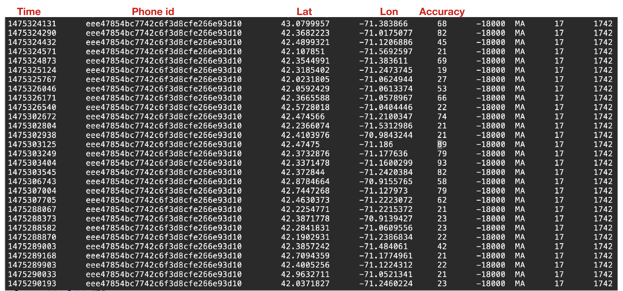 Here is what the raw data looks like. Each raw corresponds to a different location (ping) at a specific time for a particular device (id). Sometimes, companies have meta-data about the device, such as the device type, the app that generated the data, or the demographics of users of that device.