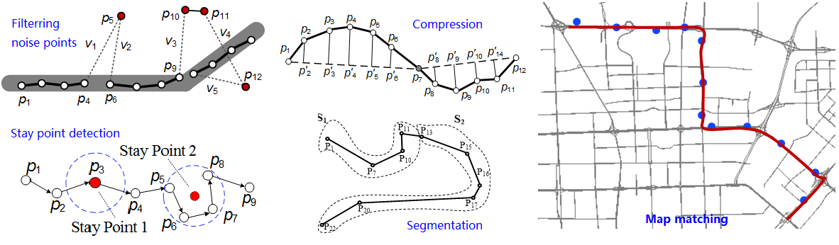 Raw data is typically processed to extract user activity and mobility information. Many techniques, including clustering, trajectory segmentation, and activity recognition, have been proposed for processing LBS data.