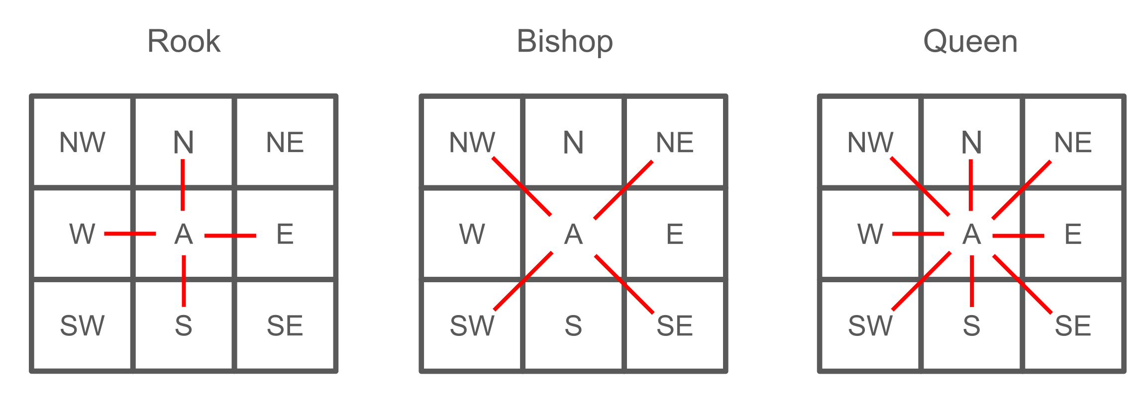 Most of the time, we use “contiguity” to define neighbors. For example, here are the Rook, Bishop, and Queen contiguity matrices for a 3x3 grid: