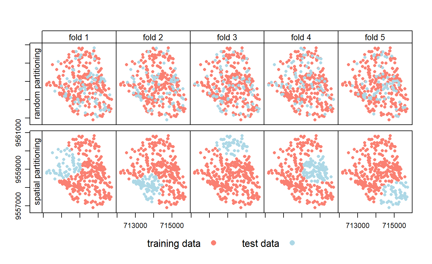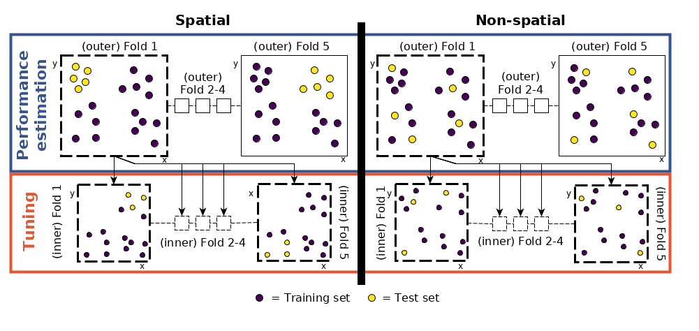 - CV by spatial distance: using the distance between data points to split the data.