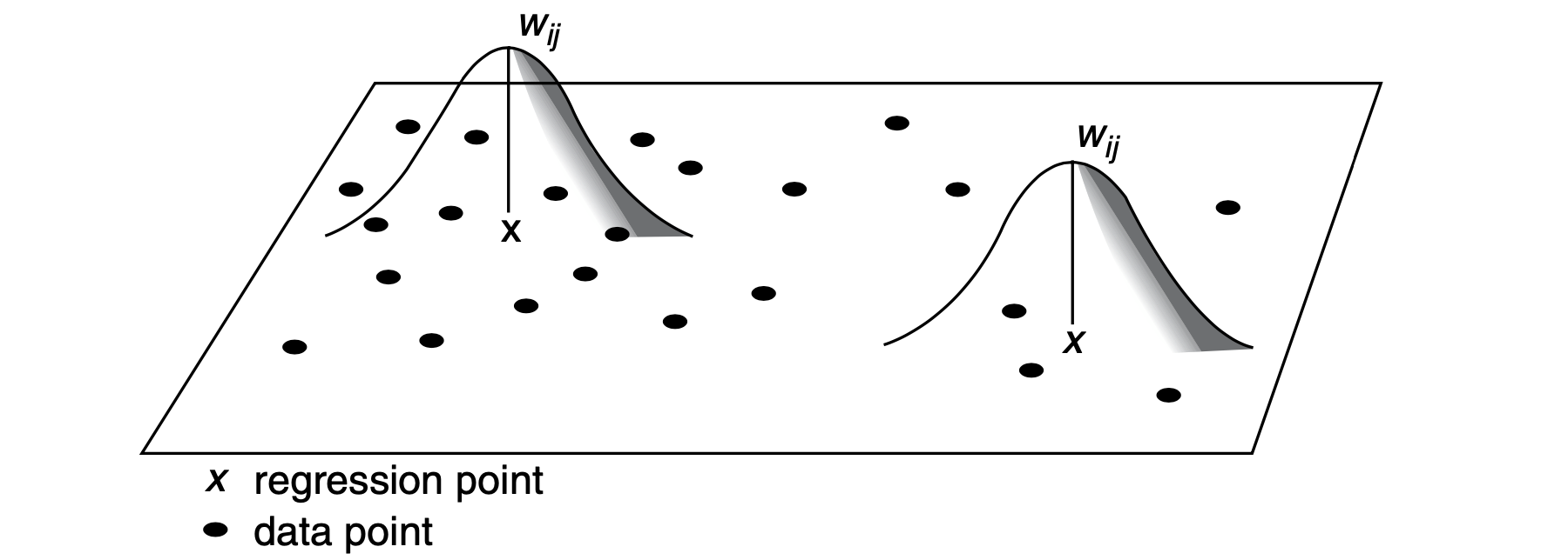 Thus, we need to define a Kernel function to define the relationship between locations. The most common kernel functions are Gaussian, Exponential, and Uniform, and they depend on whether the kernel is fixed or adaptive.