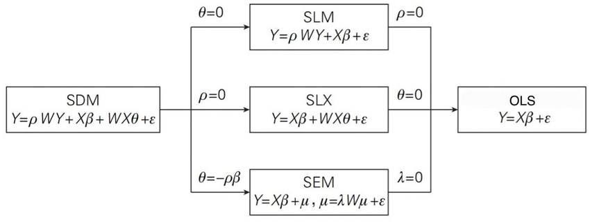 SDM: Spatial Durbin Model, where the spatial structure is introduced in the dependent and independent variables.