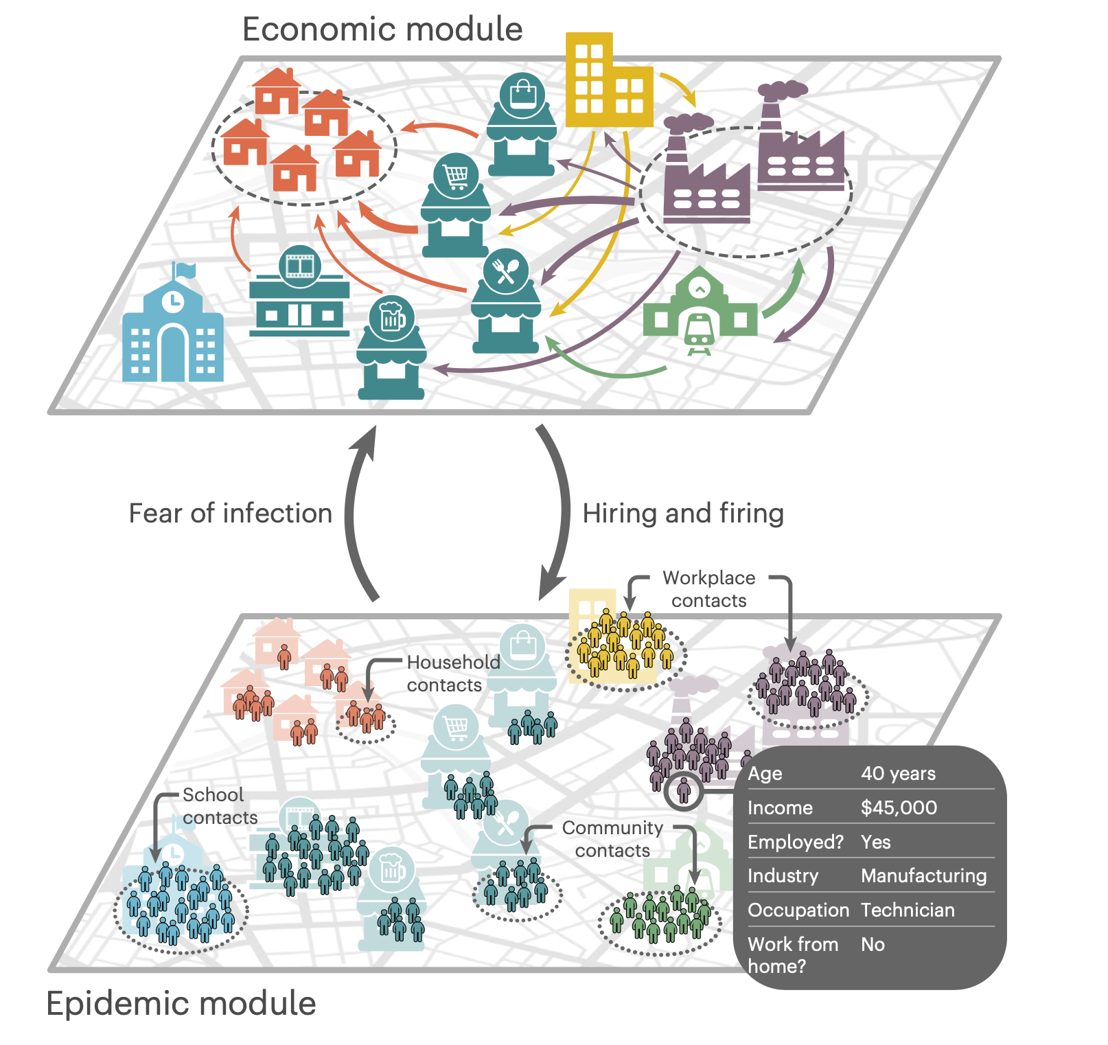 Abstract: Abstract Despite the global impact of the coronavirus disease 2019 pandemic, the question of whether mandated interventions have similar economic and public health effects as spontaneous behavioural change remains unresolved. Addressing this question, and understanding differential effects across socioeconomic groups, requires building quantitative and fine-grained mechanistic models. Here we introduce a data-driven, granular, agent-based model that simulates epidemic and economic outcomes across industries, occupations and income levels. We validate the model by reproducing key outcomes of the first wave of coronavirus disease 2019 in the New York metropolitan area. The key mechanism coupling the epidemic and economic modules is the reduction in consumption due to fear of infection. In counterfactual experiments, we show that a similar trade-off between epidemic and economic outcomes exists both when individuals change their behaviour due to fear of infection and when non-pharmaceutical interventions are imposed. Low-income workers, who perform in-person occupations in customer-facing industries, face the strongest trade-off.