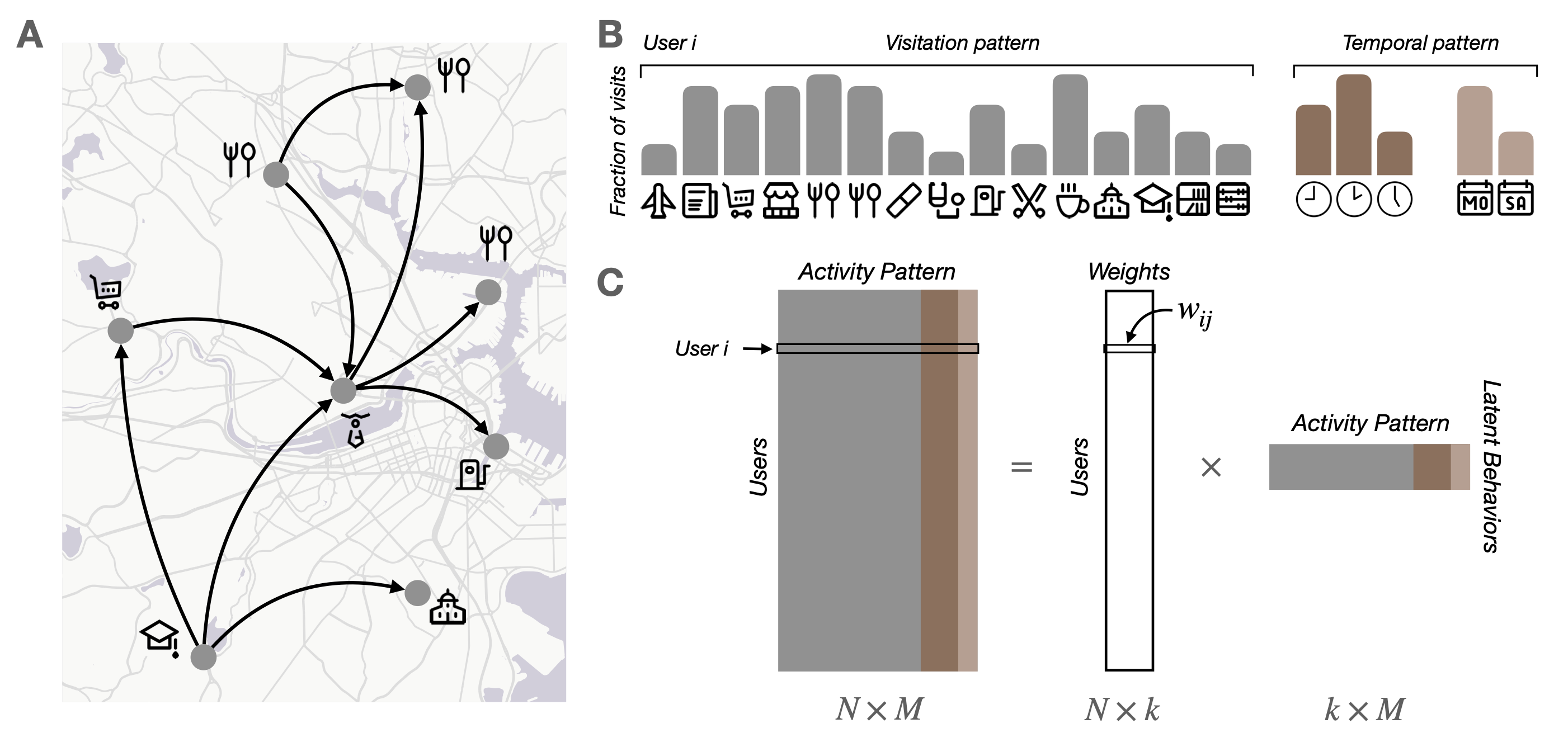 Abstract: Urbanization and its problems require an in-depth and comprehensive understanding of urban dynamics, especially the complex and diversified lifestyles in modern cities. Digitally acquired data can accurately capture complex human activity, but it lacks the interpretability of demographic data. In this paper, we study a privacy-enhanced dataset of the mobility visitation patterns of 1.2 million people to 1.1 million places in 11 metro areas in the U.S. to detect the latent mobility behaviors and lifestyles in the largest American cities. Despite the considerable complexity of mobility visitations, we found that lifestyles can be automatically decomposed into only 12 latent interpretable activity behaviors on how people combine shopping, eating, working, or using their free time. Rather than describing individuals with a single lifestyle, we find that city dwellers’ behavior is a mixture of those behaviors. Those detected latent activity behaviors are equally present across cities and cannot be fully explained by main demographic features. Finally, we find those latent behaviors are associated with dynamics like experienced income segregation, transportation, or healthy behaviors in cities, even after controlling for demographic features. Our results signal the importance of complementing traditional census data with activity behaviors to understand urban dynamics.